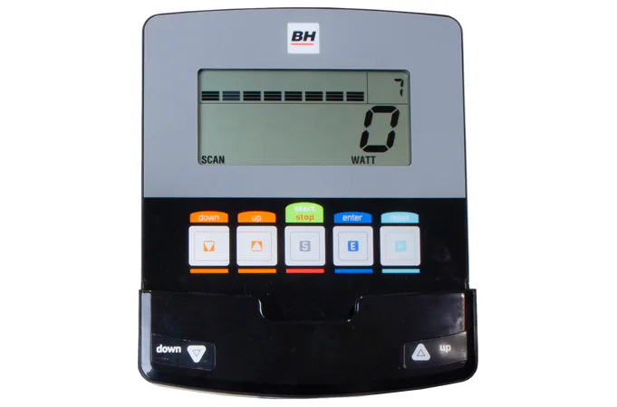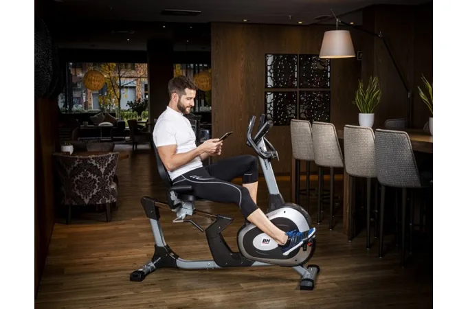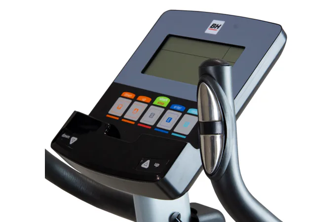 Recumbent BH Fitness Artic Comfort Program je vybaven přehledným počítačem s držákem na tablet/smartphone, senzory pro měření tepové frekvence, vyrovnávači nerovnosti, transportními kolečky a držákem na lahev.