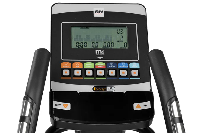 Eliptický trenažér BH Fitness Crystal 2.0 je vybaven přehledným počítačem s držákem na tablet/smartphone, senzory na měření tepové frekvence, transportními kolečky a vyrovnávači nerovnosti.