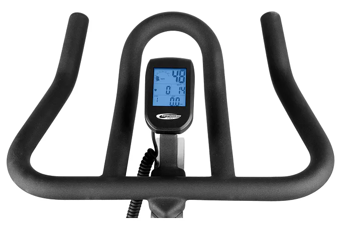 Součástí trenažéru BH Fitness Duke Magnetic je přehledný počítač, transportní kolečka, vyrovnávače nerovnosti a držák na lahev.