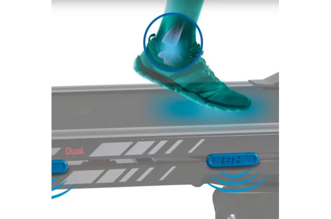 Prostorná běžecká plocha s rozměry 51 x 135 cm je vybavena kvalitním tlumícím systémem SDS (Soft Drop systém) s 6 elastomery a Run +.
