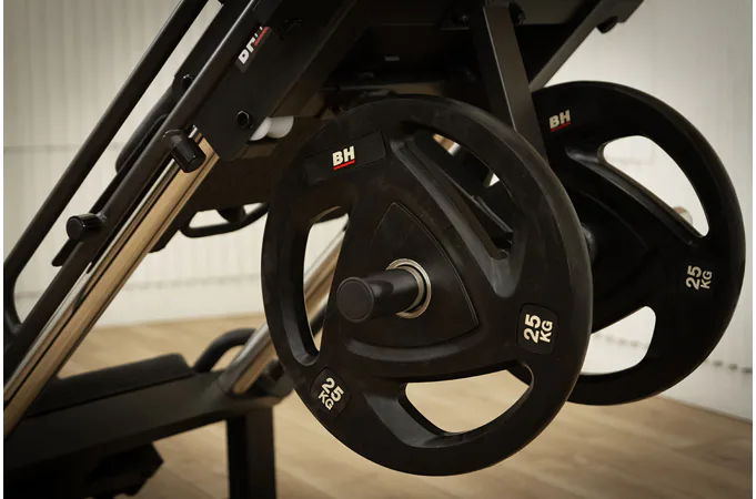 BH FITNESS Hack Squat / Leg Press má robustní konstrukci z kvalitní oceli s profi pojezdy, hmotnost uživatele je limitována 130 kg, na pojezd je možné naložit až 200 kg kotoučů.