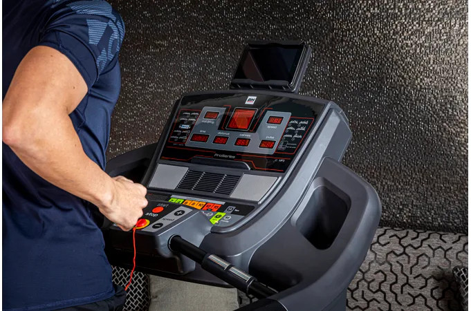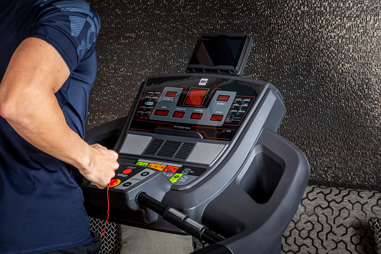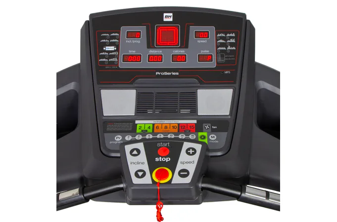 Běžecký pás BH Fitness i.Magna RC disponuje snadno ovladatelným počítačem, držákem na lahev, senzory pro měření tepové frekvence a transportními kolečky.