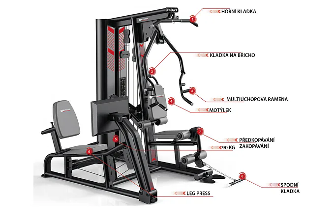 Pro maximální ergonomii při cvičení je možné polohovat sedá a zádovou opěrku. Do více poloh lze také nastavit ramena kladek a rameno s multiúchopovými madly.