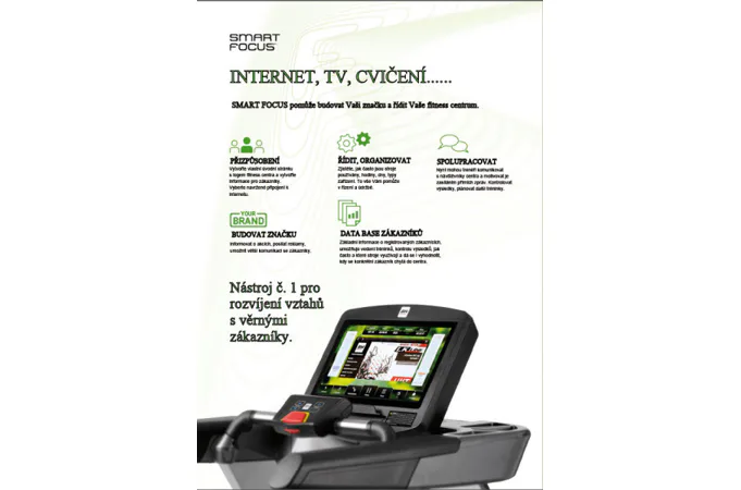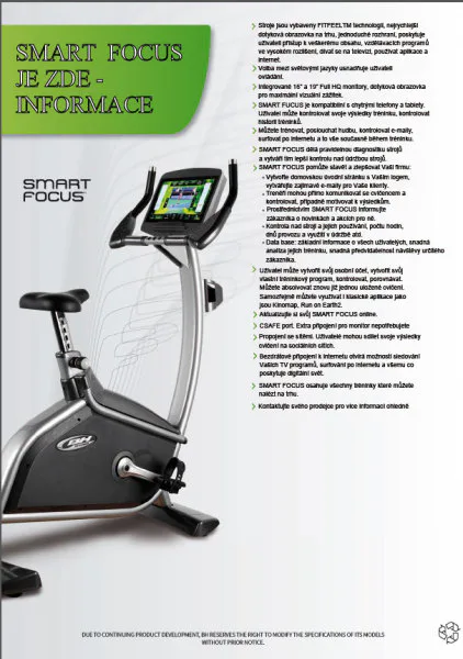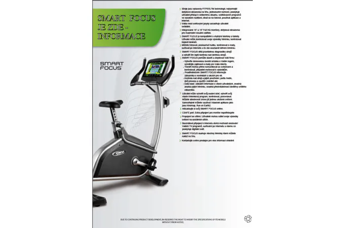 Přehledný počítač s 12" displejem SmartFocus je vybaven bohatou programovou nabídkou a poskytuje všechny potřebné informace v průběhu tréninku. Dále trenažér disponuje senzory pro měření tepové frekvence, tlačítky pro rychlé nastavení tréninkových dat, držákem na lahev, transportními kolečky a vyrovnávači nerovnosti.