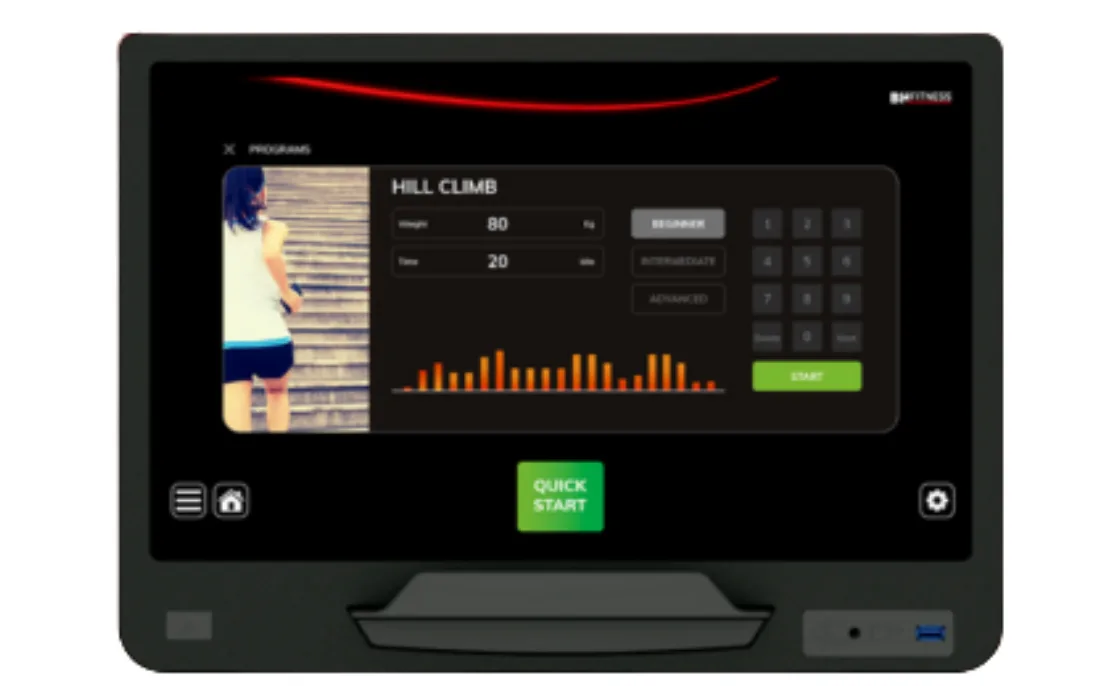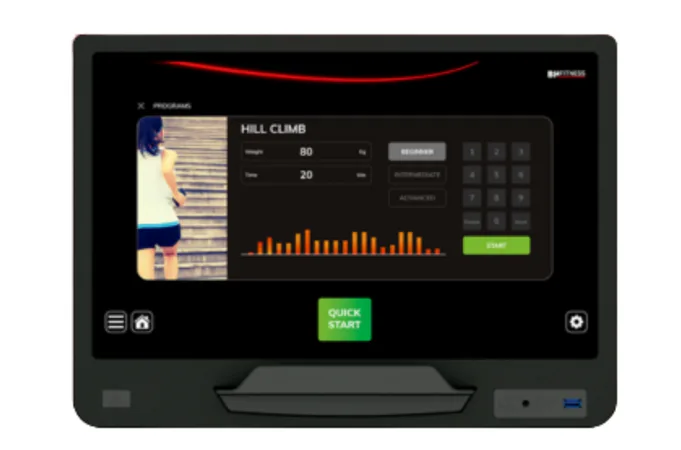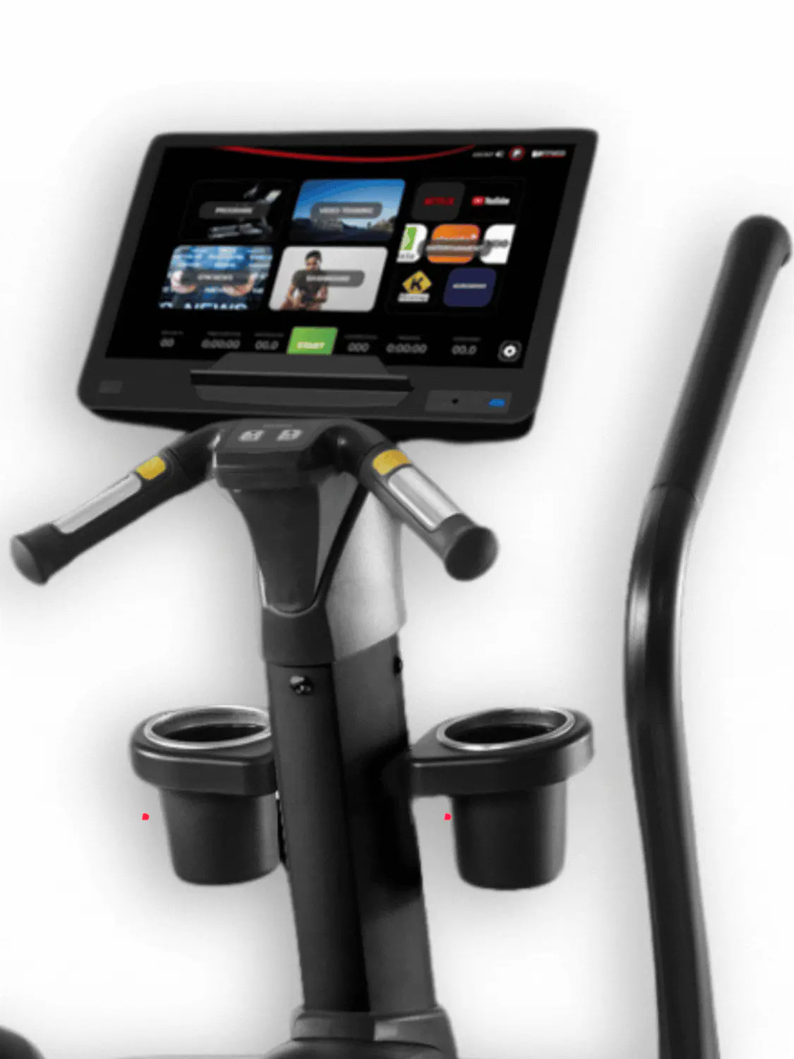 Přehledný počítač s 19" 4K displejem SmartFocus je vybaven bohatou programovou nabídkou a poskytuje všechny potřebné informace v průběhu tréninku. Dále disponuje senzory pro měření tepové frekvence, tlačítky pro rychlé nastavení tréninkových dat, držákem na lahev, transportními kolečky a vyrovnávači nerovnosti.