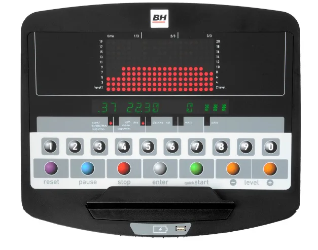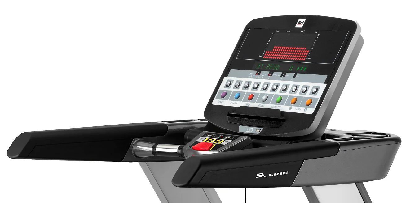 Běžecký pás BH Fitness SK7990 disponuje snadno ovladatelným počítačem, držákem na lahev, senzory pro měření tepové frekvence a transportními kolečky.