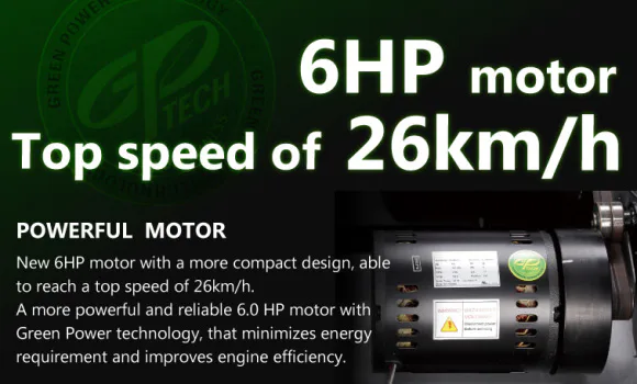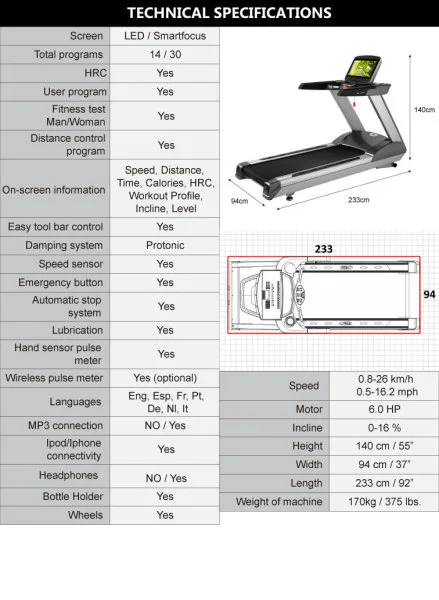 Díky střídavému AC motoru s maximálním výkonem 8 HP (5,96 kW) a trvalým výkonem 6 HP, který je určen i do komerčního provozu umožňuje stroj dlouhodobě využívat rychlost v rozmezí 0,8 - 20 km/h při sklonu do 16 %. Prostorná, odpružená běžecká plocha má rozměry 55 x 161 cm.