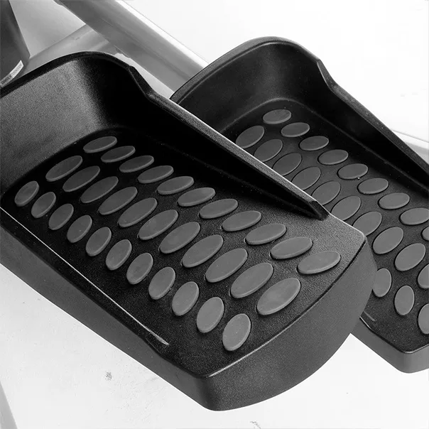 Délka kroku je 52 cm a vzdálenost mezi pedály je pouhé 4 cm. Robustní pedály jsou z kvalitního plastu s protiskluzovou plochou pro maximální stabilitu při cvičení. Plynulý chod zajišťuje kladkový řemen a kalibrovaný těžký 35 kilový setrvačník.