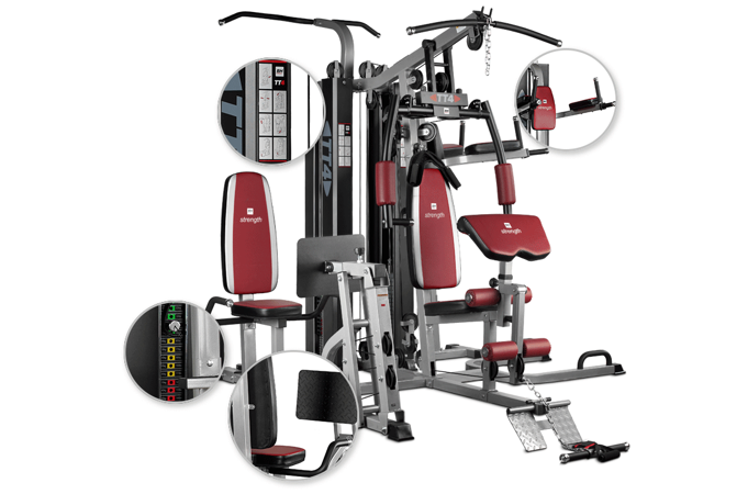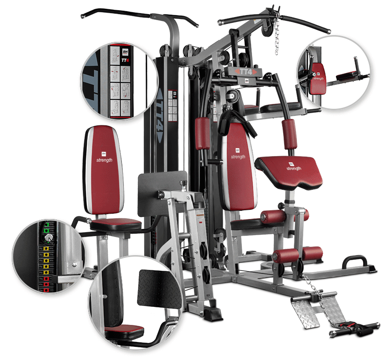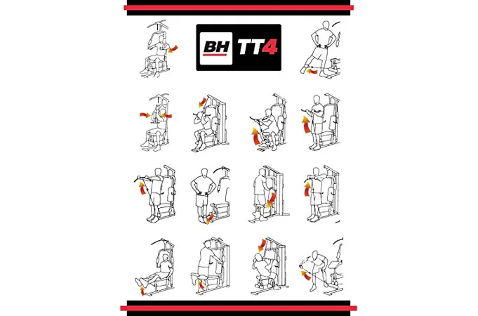 Věž BH Fitness TT-4 nabízí 2 zásobníky zátěže a to jeden pro leg press a druhý pro ostatní kladky. Zároven nabízí 15 druhu cvičení formou tricepsových kliků, tlaků na prsa, kladek atd.