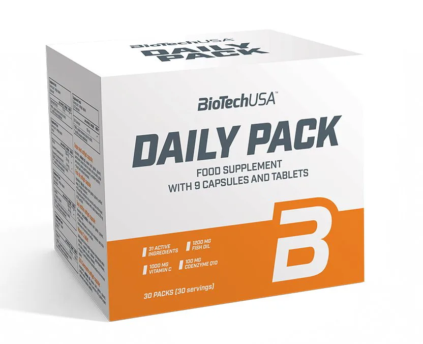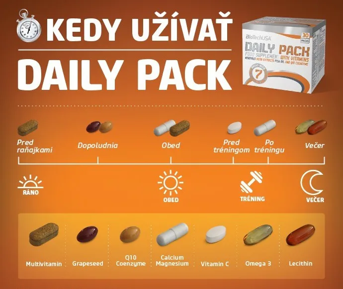 BIOTECH USA Daily Pack. Každodenní život tě zkouší, hodně trénuješ, nebo závodně sportuješ? Pokud se ti jednotabletové verze nezdají být dostatečně mnohostranné, pak už jistě máš za sebou pokusy sestavit ze spousty různých přípravků svůj vlastní balíček výživových doplňků. Moře tablet a kapslí tě zcela pohltilo? Ty časy jsou pryč! My jsme tvoji sadu již sestavili: kromě vitamínů a minerálů jsme přidali také omega 3, lecitin a rostlinné extrakty, včetně extraktu z hroznových jader a enzymů!