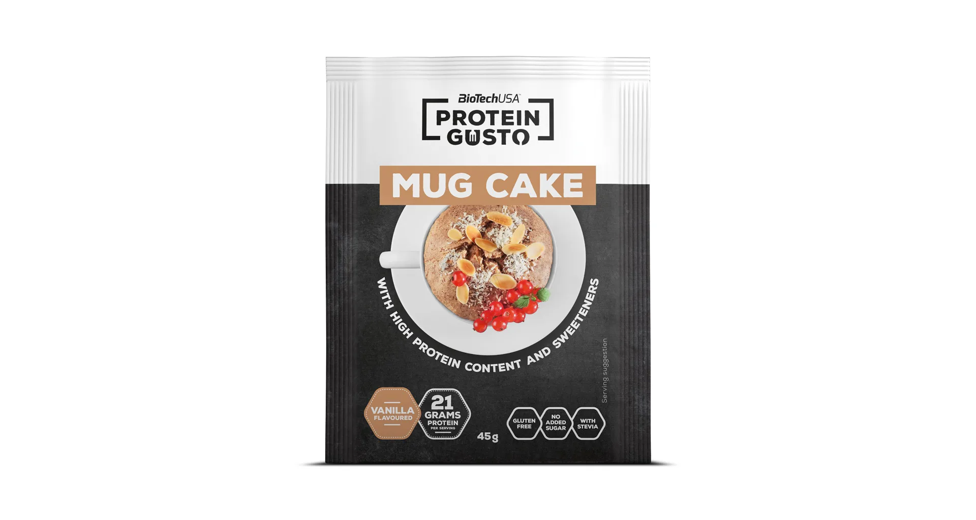 Protein Gusto Mug Cake je hrnkový koláč, který se připravuje v mikrovlné troubě. Přidáním speciálního proteinového komplexu se jeho obsah proteinu výrazně zvýšil, snížil se obsah sacharidů a cukr byl odstraněn úplně. Je jednoduchý na přípravu, všechno co potřebujete je váš oblíbený hrnek, který naplníte koláčovým práškem zmíchaný s nízkotučným mlékem a necháte ho "upéct" v mikrovlnce. Pohodlné balení jedné porce je lehce přenosné, můžete si ho pripravit kdekoliv, kde budete mít chuť na sladké. Koláč je vyrobený z ryžové mouky, a proto je vhodný i pro lidi citlivé na pšenici. Recept si můžete přizpůsobit podle vlastní chuti.