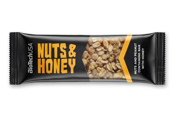 Kousky arašídů 55%, kousky mandlí 10%, fruktózový sirup, glukózový sirup, extrudované cereálie (celozrnná pšeničná mouka, pšeničná rýže, cukr, sůl), med 5%, kousky lískových oříšků 2%, kousky para ořechů 2%, dextróza, emulgátor lecitiny.