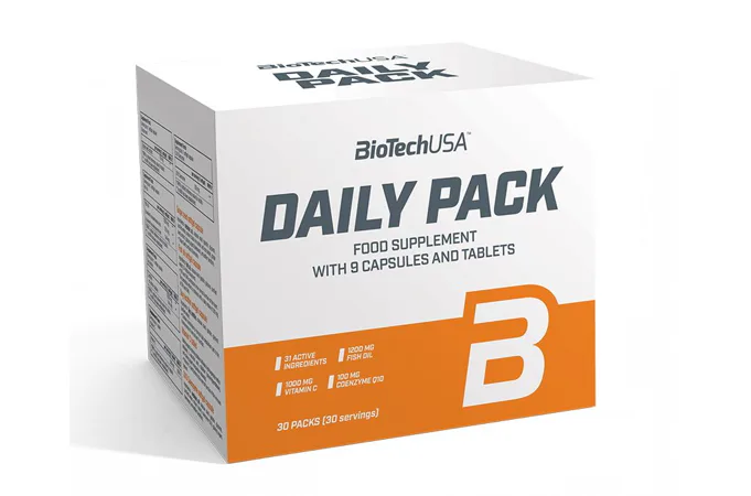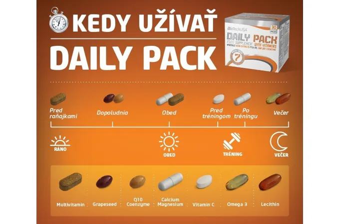 BIOTECH USA Daily Pack. Každodenní život tě zkouší, hodně trénuješ, nebo závodně sportuješ? Pokud se ti jednotabletové verze nezdají být dostatečně mnohostranné, pak už jistě máš za sebou pokusy sestavit ze spousty různých přípravků svůj vlastní balíček výživových doplňků. Moře tablet a kapslí tě zcela pohltilo? Ty časy jsou pryč! My jsme tvoji sadu již sestavili: kromě vitamínů a minerálů jsme přidali také omega 3, lecitin a rostlinné extrakty, včetně extraktu z hroznových jader a enzymů!