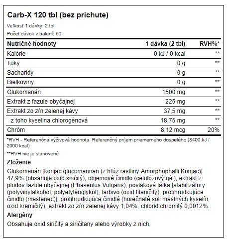 BioTech Carb-X sestává z rozpustné vlákniny (glukomannan), která je obohacena o extrakty z fazolu obecného a zelené kávy. Glukomannan podporuje hubnutí, kontroluje vstřebávání živin a udržuje optimální hodnotu cholesterolu v krvi. Carb-X je navíc obohacen o chrom, který zlepšuje metabolismus makroživin a udržuje normální hladinu cukru v krvi. Přidaný extrakt z fazolu obecného zabraňuje přeměně sacharidů na tuk. Extrakt ze zrn zelené kávy obsahuje až 50% kyseliny chlorogenové a je přírodním zdrojem kofeinu.