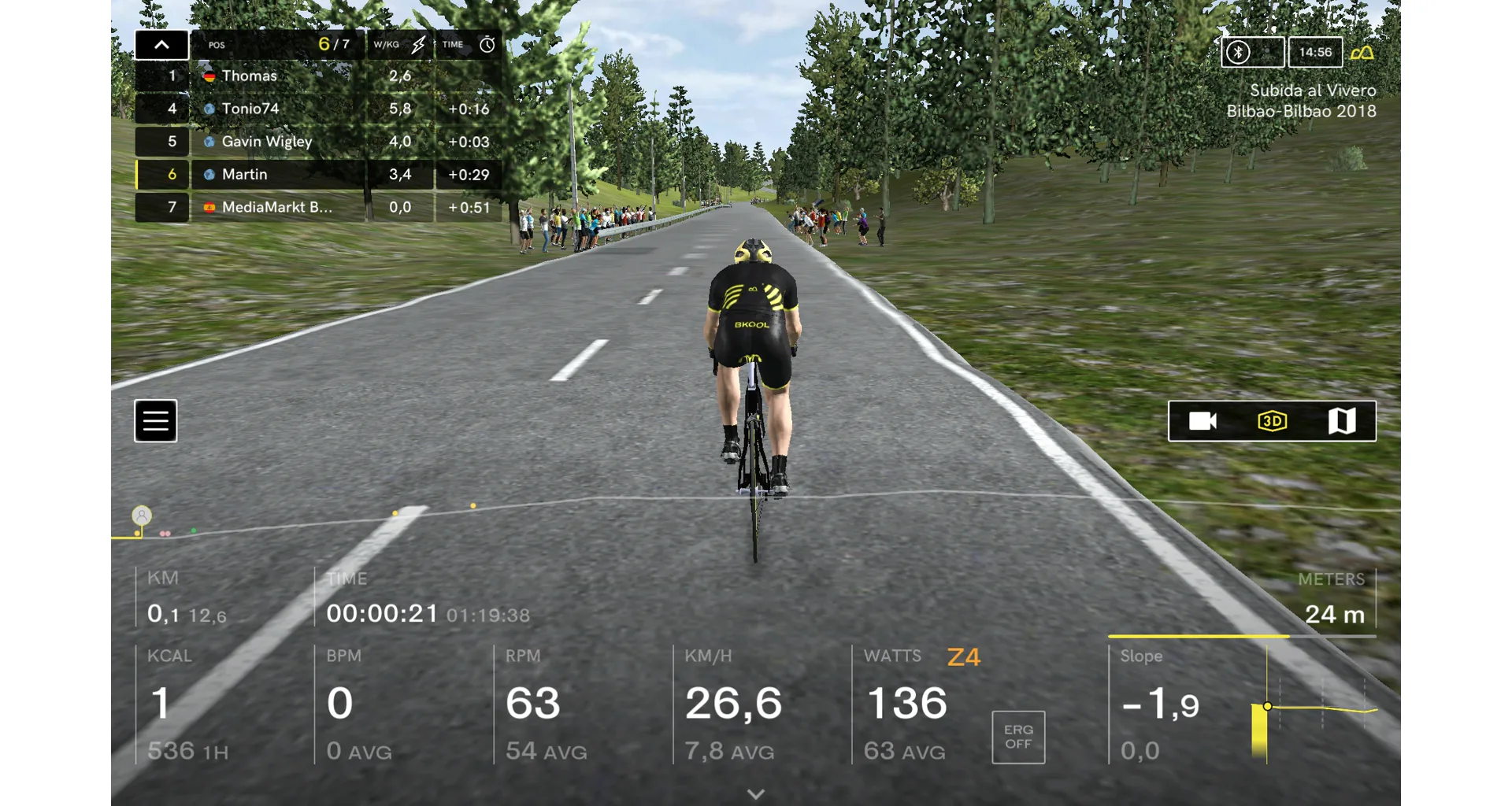 Aplikaci BKOOL s vaším trenažérem spárujete pomocí bluetooth a následně vám bude sama upravovat zátěž na trenažéru, podle toho v jaké části trati se nacházíte.