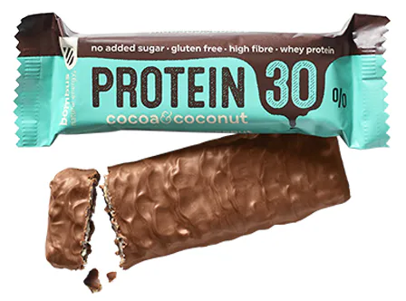 Coconut a cocoa - Směs proteinů 25,4% (koncentrát syrovátkových 11% a mléčných bílkovin, sójový proteinový izolát), mléčná čokoláda se sladidlem 17% (sladidlo: maltitol, kakaové máslo, sušené odstředěné mléko, kakaová hmota, kakaový prášek se sníženým obsahem tuku, emulgátor: řepkový lecitin, aroma), oligofruktóza, sladidlo: maltitol, krém s vanilkovou příchutí se sladidlem 10% (sladidlo: maltitol, kakaové máslo, řepkový olej, sušená syrovátka, sušené odstředěné mléko, emulgátor: řepkový lecitin, vanilkové aroma), zvlhčující látka: glycerol, řepkový olej, hydrolyzovaný kolagen 4%, sójové proteinové křupínky 3% (izolovaný sójový protein, tapiokový škrob), kakaový prášek se sníženým obsahem tuku 2%, kokos 1%, kakaové máslo, emulgátor: řepkový lecitin, přírodní aroma. Může obsahovat arašídy a suché skořápkové plody. Bezlepkový výrobek. Nadměrná konzumace může vyvolat projímavé účinky.