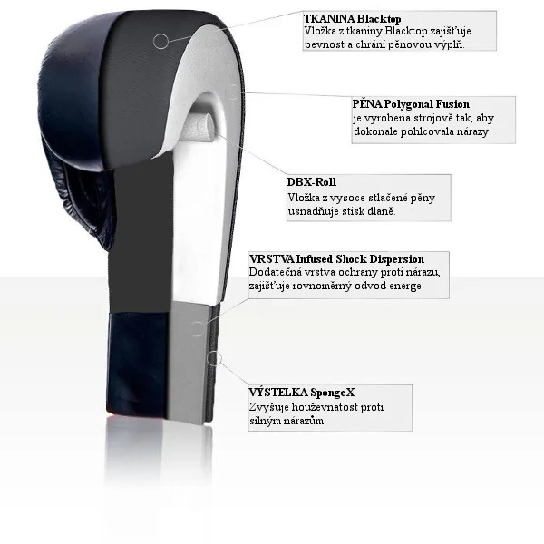 Hřbetní část rukavice je vyplněná speciální obměnou paměťové pěny, která dokonale pohlcuje údery i během delšího a intenzivnějšího tréninku jak na boxovacím pytli, tak na terči či při tréninku se sparing partnerem. Bezpečnost rukavic zajištuje pásek se suchým zipem pro zpevnění zápěstí a prostor pro palec spojený řemínkem se zbytkem rukavice, tyto prvky minimalizují možnost zranění.