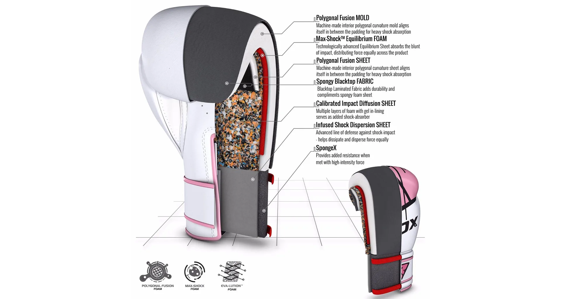 Dámské boxerské rukavice RDX F7 pink jsou pevné a odolné a jejich design nabízí styl a eleganci, jsou navrženy tak, aby seděly na ženské ruce. Pevná kůže Maya Hide a vycpávka z pěny s vysokou hustotou poskytují odolné boxerské rukavice, které skvěle tlumí údery a zaručují uživateli každodenní bezproblémové využití jak při tréninku na boxovacím pytli, tak se sparing partnerem. Rukavice jsou jedinečně navrženy tak, aby odpovídaly anatomii ženské ruky.