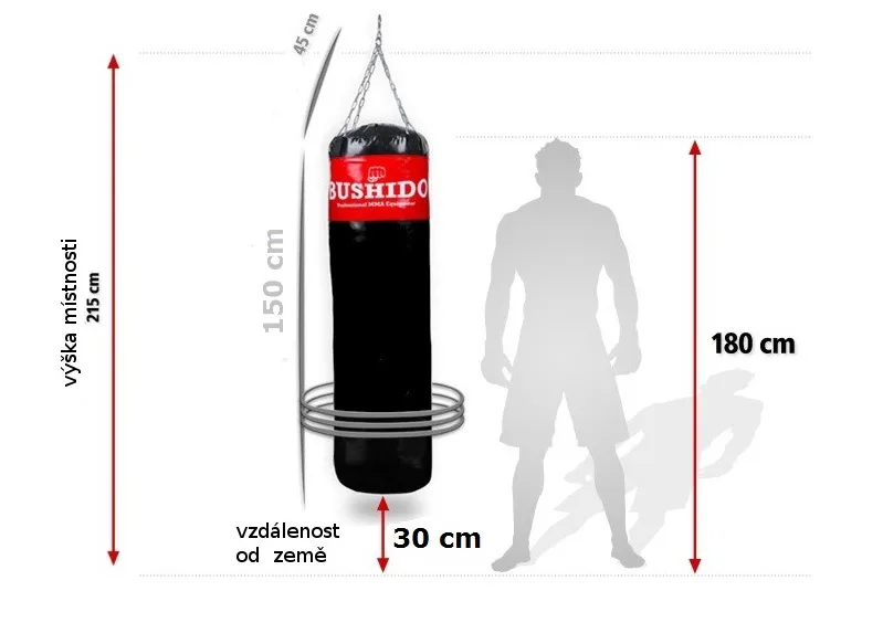 Profesionální boxovací pytel DBX BUSHIDO 150 x 40 cm. Délka řetezů při zavěšení 45 cm (díky karabině lze nastavit i kratší délku). Je vyroben z patentovaného 7-vrstvého materiálu s výbornou odolností.