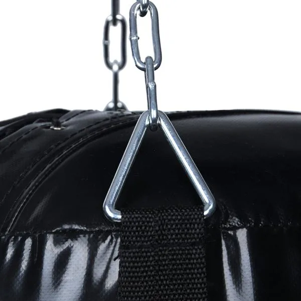 Prázdný boxovací pytel DBX BUSHIDO 150 x 45 cm. Délka řetezů při zavěšení 45 cm (díky karabině lze nastavit i kratší délku). Rozměry pytle 150 x 45 cm jsou ideální pro domácí tréninky. Pytel je dodáván prázdný a po vyplnění textilními materiály se jeho hmotnost pohybuje kolem 40 kg.
