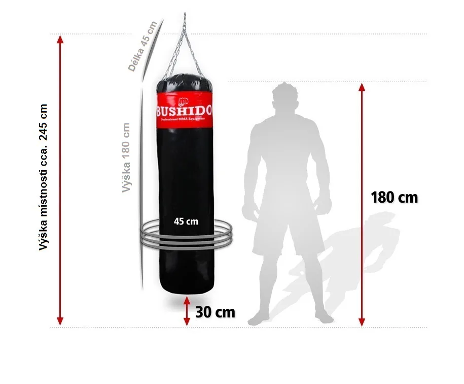 Profesionální boxovací pytel DBX BUSHIDO 180 x 45 cm. Délka řetezů při zavěšení 45 cm (díky karabině lze nastavit i kratší délku). Je vyroben z patentovaného 7-vrstvého materiálu s výbornou odolností.