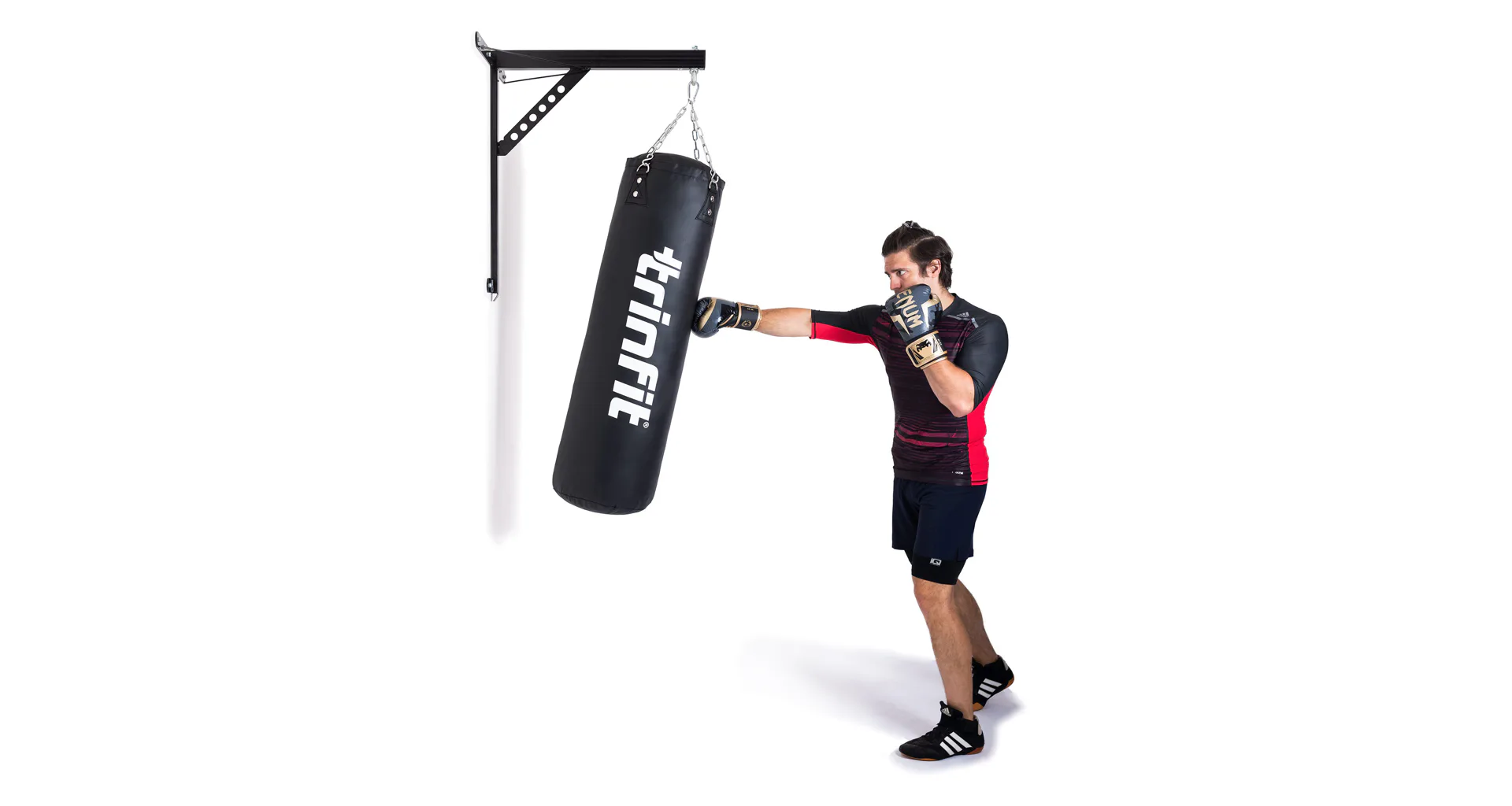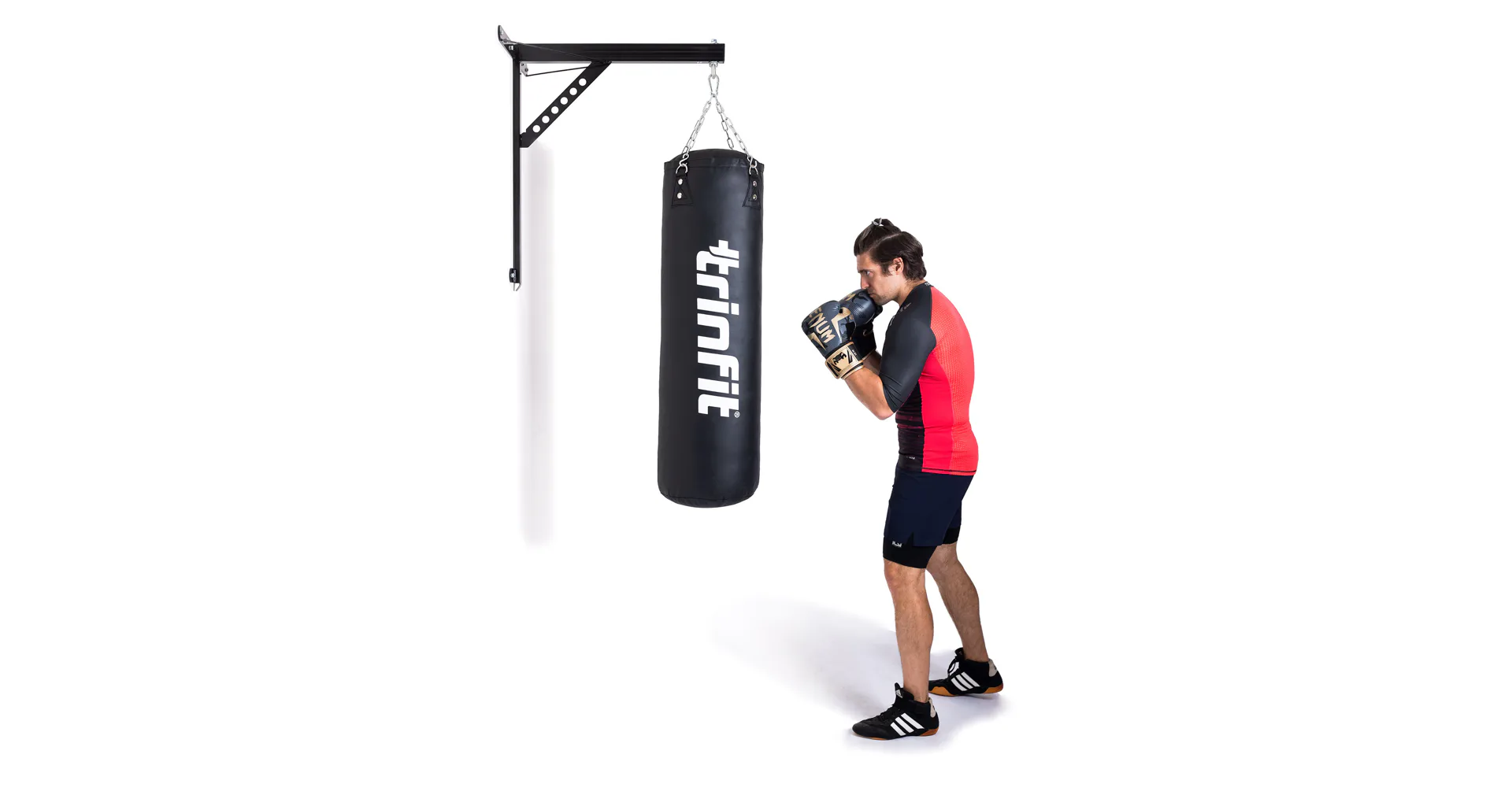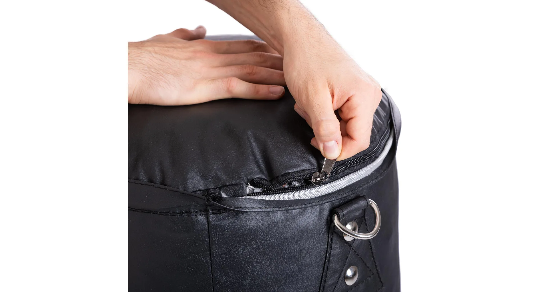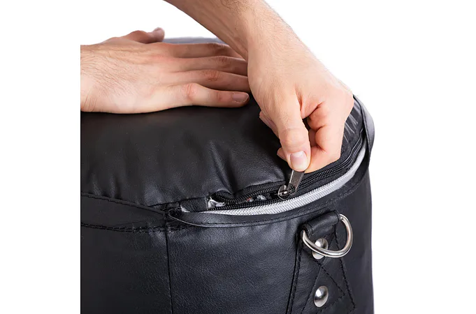Boxovací pytel TRINFIT Luxury je snadno upevnitelný za extra vyztužené popruhy s ocelovými kroužky, pomocí závěsného řetězu, který je součástí objednávky.