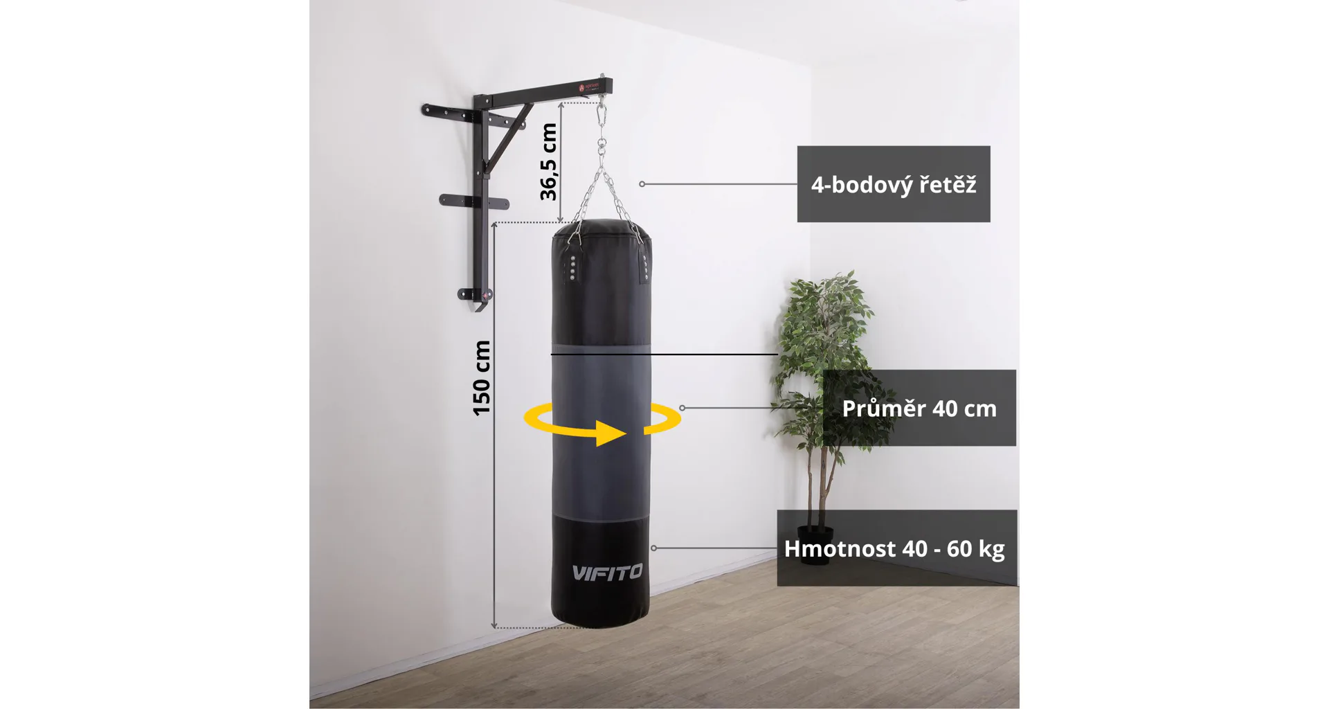 VIFITO Vario se snadno zavěšuje pomocí závěsného řetězu s karabinou, který je součástí balení. Tento pytel je dokonalým pomocníkem pro trénink boxu, bojových umění nebo kondičního cvičení. Přídavná závaží ani držák (šibenice) nejsou součástí dodávky, můžete si je u nás dokoupit!