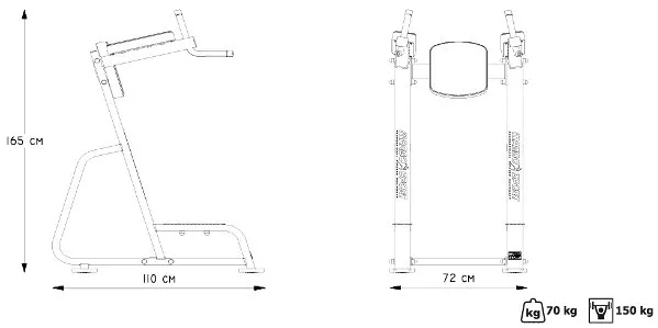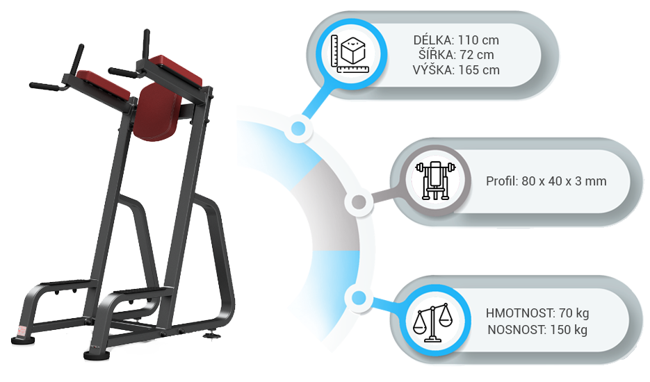 Robustní a stabilní konstrukci zaručuje hmotnost konstrukce 70 kg a použitý profil 80 x 40 x 3 mm. Polstrování je vyrobeno z pevné, umělé kůže dvojitě prošité pevnou nití značky Coats. Oporu zajištuje 3 mm hrubá ocelová deska. Nášlapy jsou vyrobeny z vroubkované, masivní ocelové desky.
