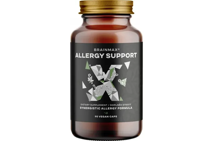 BrainMax Allergy Support je kombinace deseti látek a extraktů z bylin navržených tak, aby poskytoval efektivní pomoc dýchacím cestám při alergii. Obsahuje kvercetin, bromelain, lipozomální vitamín C, extrakt z kopřivy dvoudomé, děvětsilu, řimbaby spolu s N-Acetyl-L-Cysteinem a antioxidanty apigeninem a pycnogenolem. Kapsle jsou rostlinného původu a neobsahují žádné balastní látky ani éčka.