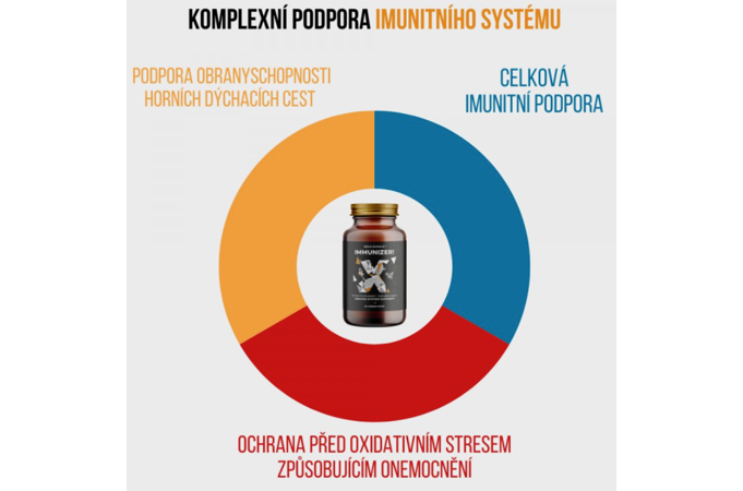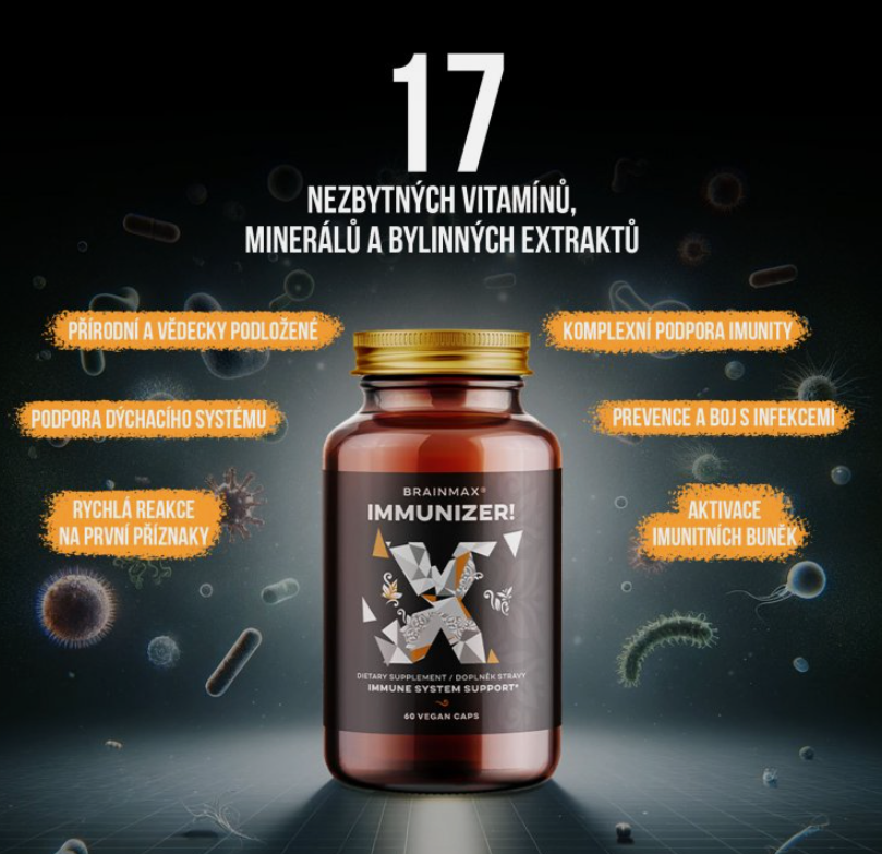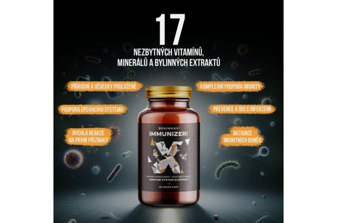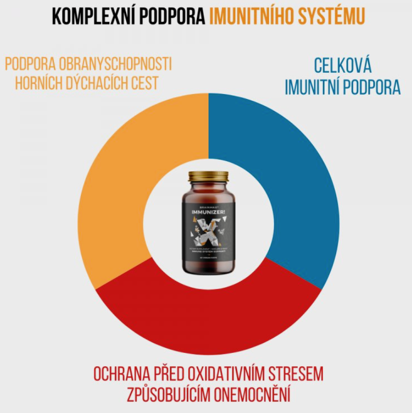 BrainMax IMMUNIZER obsahuje komplex 17 přírodních a vědecky ověřených látek pro podporu imunity. Je navržen tak, aby působil jako prevence, ale také pro přímý boj s nachlazením a infekcí. Díky své komplexnosti působí na několika úrovních: podpora imunity, dýchacího systému, ochrana buněk před oxidativním stresem, aktivace imunitních buněk, zajištění normální funkce dýchacích cest. Všechny látky ve složení působí dohromady mimořádně účinně ať už při prevenci nebo při řešení akutního nachlazení. Vždy je však třeba jednat rychle už v začátcích nachlazení.