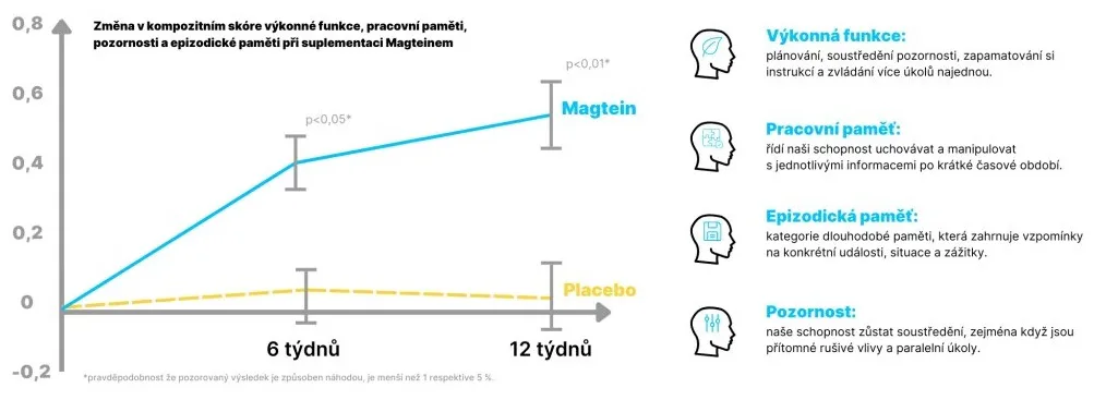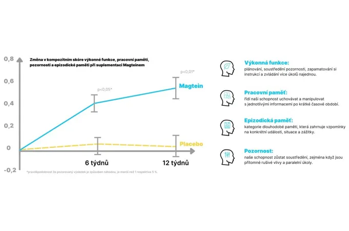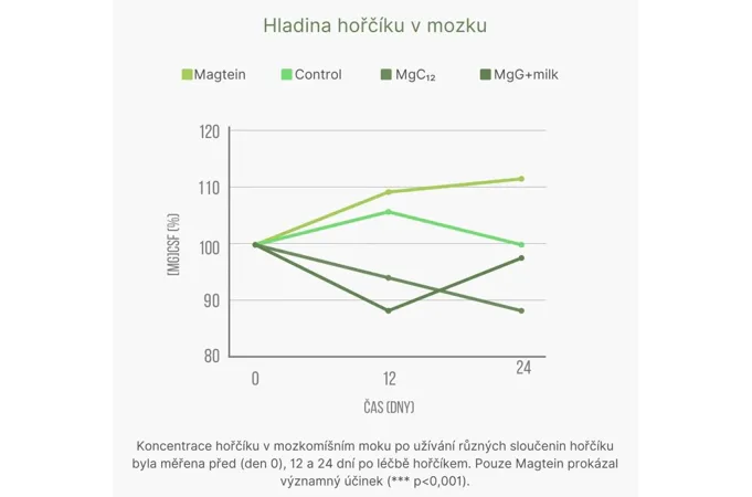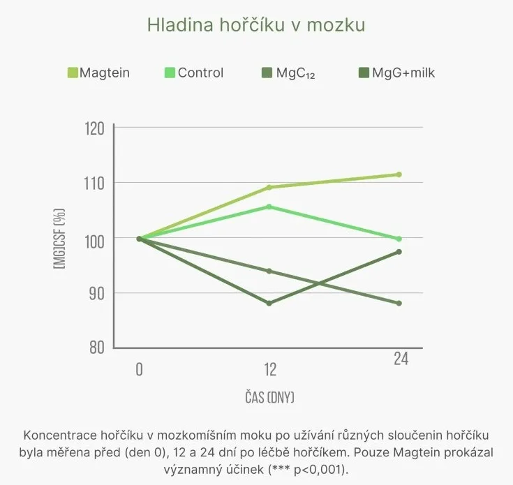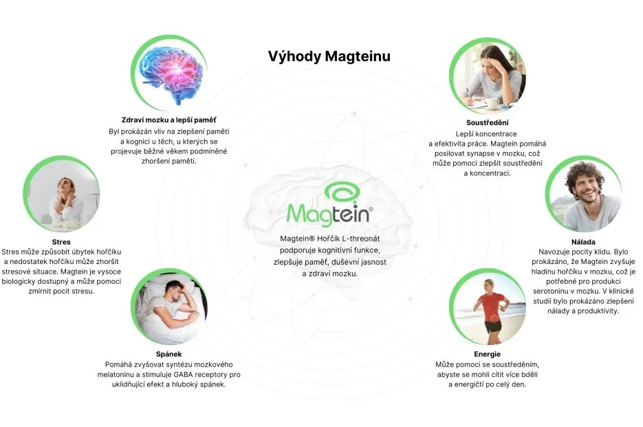 Máme tu čest uvést na trh jako první evropská firma patentovanou formu hořčíku Magtein® neboli magnesium l-treonát. Tato speciální forma hořčíku dokáže projít přes hematoencefalickou bariéru do mozku a tam přímo v neuronech navýšit koncentraci tohoto životně důležitého minerálu. Díky prostupnosti do mozku pozitivně působí na zdraví mozku, spánek, stres či úzkost a kognitivní schopnosti jako jsou paměť a koncentrace. Tyto vlastnosti jsou potvrzeny studiemi a nedisponuje jimi žádná jiná forma hořčíku. Produkt je 100% bez balastních látek.