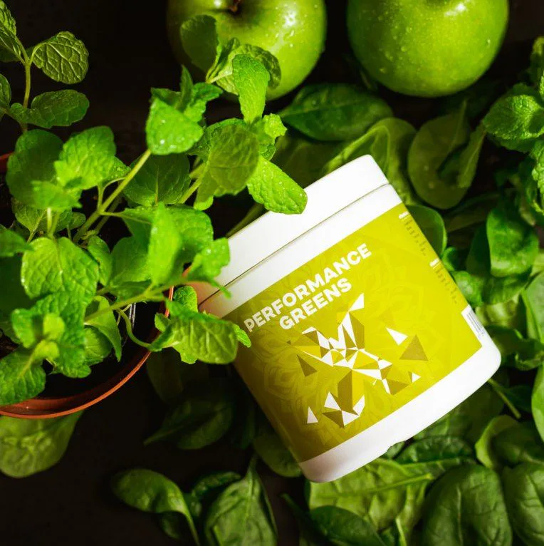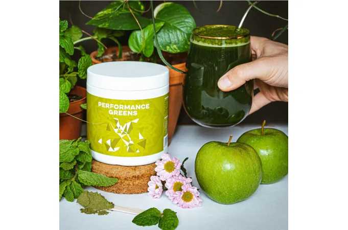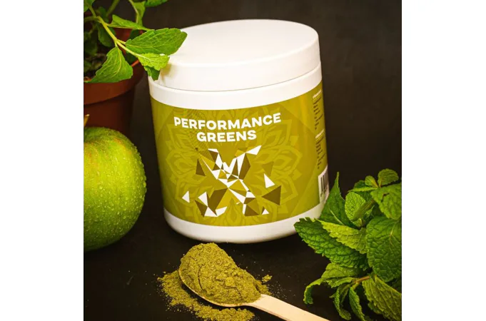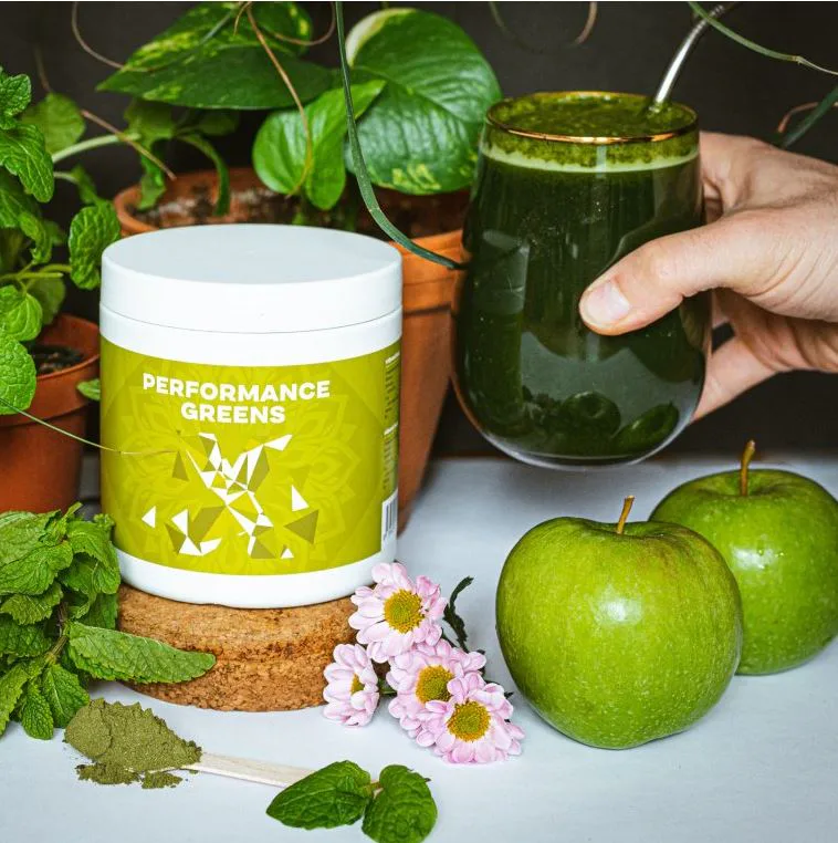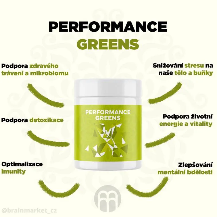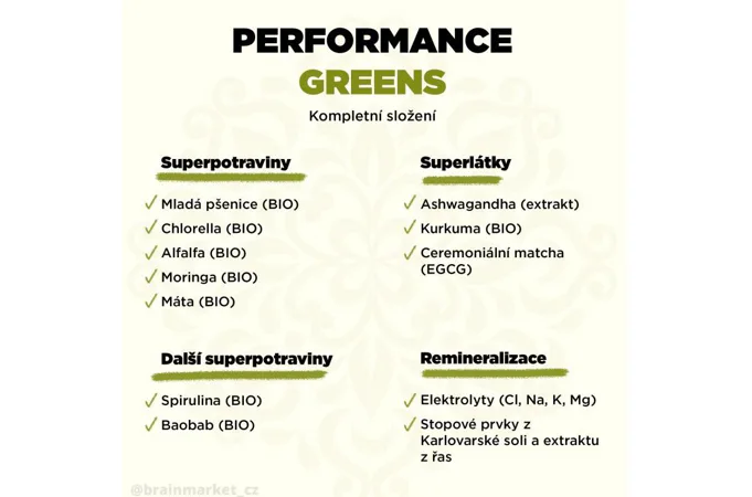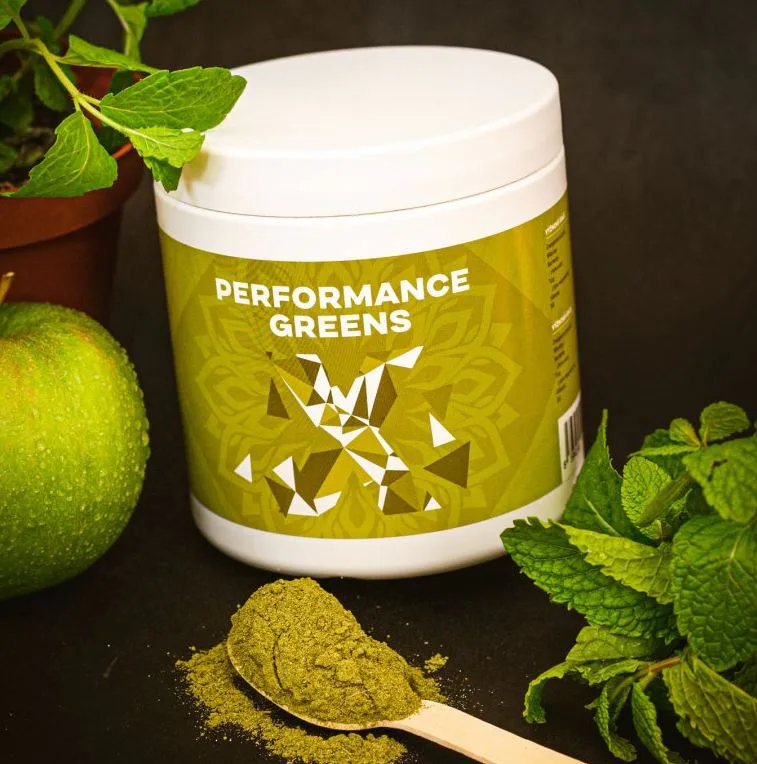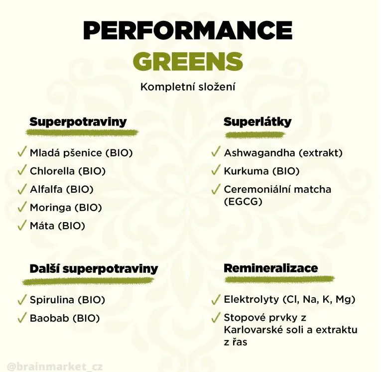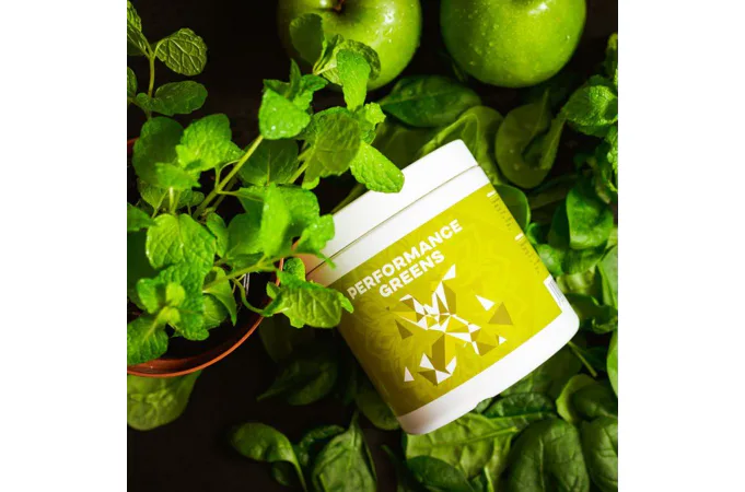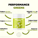 Performance Greens je směs super zelených rostlin pro podporu imunity, energie, trávení, tvorbu hemoglobinu, činnost srdce i jater detoxikace organismu. Kromě zelených superpotravin obsahuje také Ashwagandhu. Adaptogen, který má vysoký obsah antioxidantů, posiluje organismus, podporuje funkce reprodukčního systému a koncentraci. Dalším nezanedbatelným pilířem Performance Greens pro remineralizaci organismu jsou elektrolyty obohacené o stopové prvky z mořských řas a karlovarské soli. Kromě vysokého obsahu vitamínů skupiny B, C, E a K, obsahuje Performance Greens také vysoké množství chlorofylu a vlákniny. Směs je bohatá na antioxidanty, které chrání naše buňky před oxidačním stresem. Zelené potraviny jsme doplnili o kurkumu, která působí také jako antioxidant a má pozitivní vliv na imunitní systém, trávení, játra, kardiovaskulární systém, nervovou soustavu, dýchací soustavu, stav kloubů, kostí a pokožky a duševní rovnováhu.
