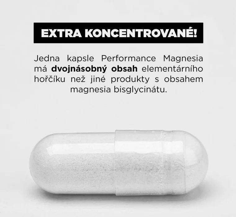 Performance Magnesium nyní obsahuje v jedné kapsli 1.000 mg vysoce vstřebatelného magnézia bisglycinátu a 1,4 mg vitamínu B6 v aktivní formě Pyridoxal-5-Phosphate s vysokou biodostupností. Neobsahuje žádné balastní látky (éčka), pouze čisté deklarované složení. 1 kapsle obsahuje 200 mg elementárního hořčíku. Kapsle jsou vegetariánské.