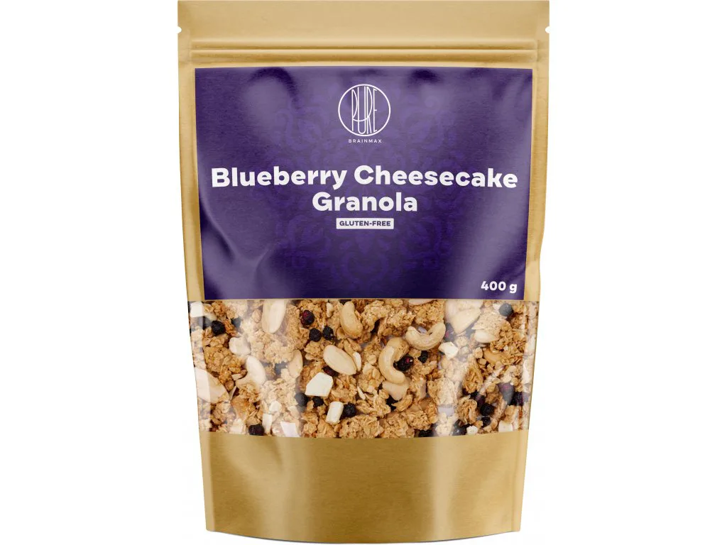 Představujeme vám dokonalou harmonii chutí v poctivě zapečené granole. Do BrainMax Pure Blueberry Cheesecake Granoly jsme vybrali pouze ty nejkvalitnější suroviny a nepřidali žádné zbytečné konzervanty, cukr ani barviva.