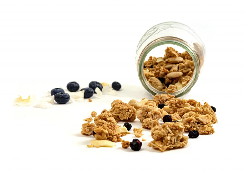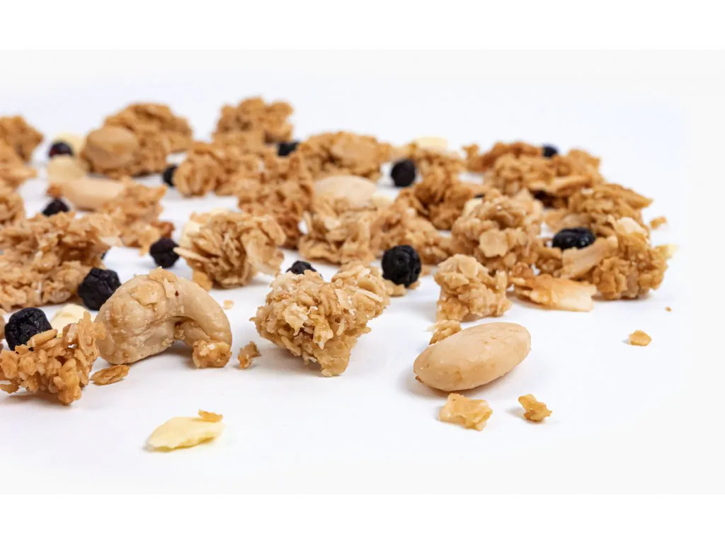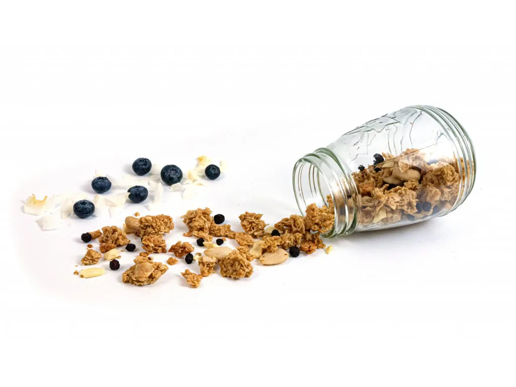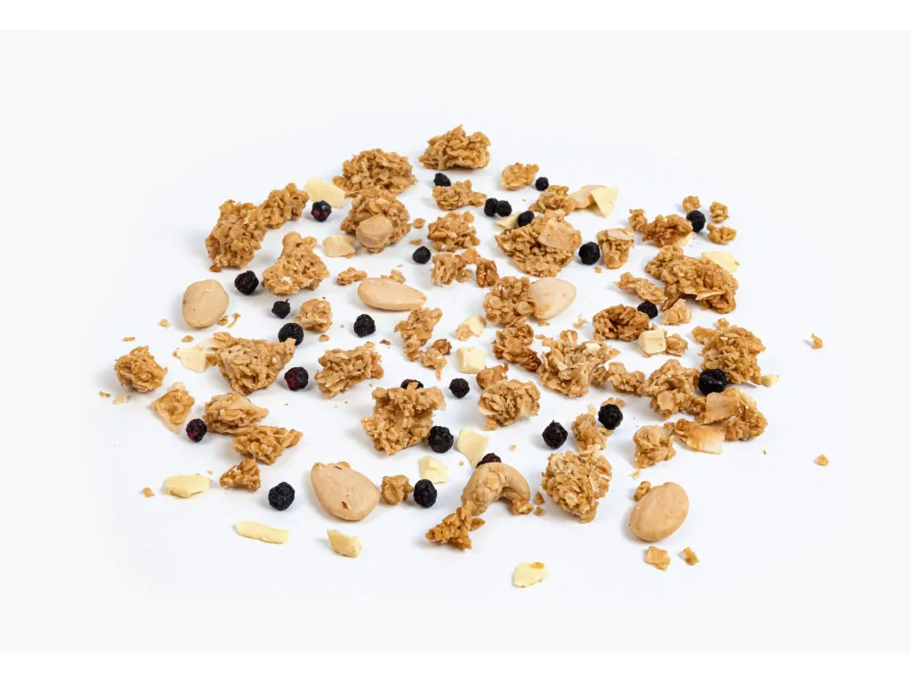 Složení: bezlepkové ovesné vločky*, kokosový sirup*, mandlový krém*, (8%) bílá čokoláda (sladidlo: maltitol, kakaové máslo, sušené plnotučné mléko, emulgátor: sojový lecitin, přírodní vanilkové aroma), kešu ořechy*, (5%) kokosové chipsy*, mandle*, kokosová smetana*, kokosový olej*, (2,6%) lyofilizované borůvky, (2,5%) kokos*, sůl. *Surovina v BIO kvalitě. Tento produkt obsahuje 89,25% ingrediencí v BIO kvalitě. Výrobek je bezlepkový. Alergeny jsou vyznačeny tučně ve složení. Obsahuje skořápkové plody a mléčné bílkoviny.