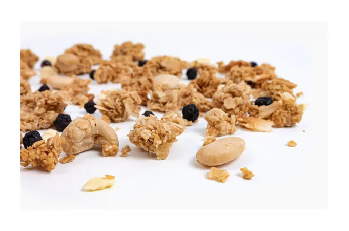 Základem opravdu velkých a na jazyku se rozplývajících kousků nové Blueberry Cheesecake granoly jsou BIO bezlepkové ovesné vločky. Na nejkřupavější textuře se podílí poctivá dávka mandlí, kešu ořechů a kokosových chipsů. Explozi chutí podtrhují svěží kyselkavé lyofilizované borůvky a exotická chuť kokosu.