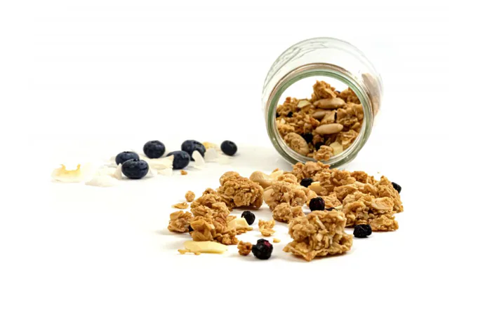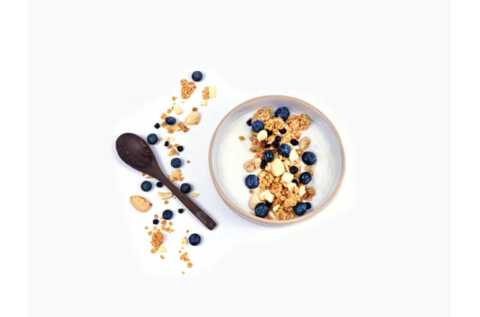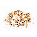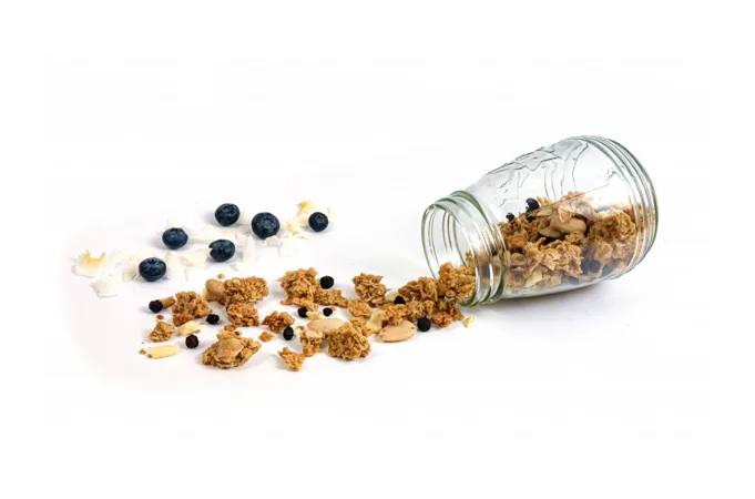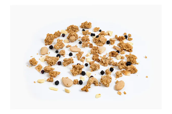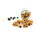 Složení: bezlepkové ovesné vločky*, kokosový sirup*, mandlový krém*, (8%) bílá čokoláda (sladidlo: maltitol, kakaové máslo, sušené plnotučné mléko, emulgátor: sojový lecitin, přírodní vanilkové aroma), kešu ořechy*, (5%) kokosové chipsy*, mandle*, kokosová smetana*, kokosový olej*, (2,6%) lyofilizované borůvky, (2,5%) kokos*, sůl. *Surovina v BIO kvalitě. Tento produkt obsahuje 89,25% ingrediencí v BIO kvalitě. Výrobek je bezlepkový. Alergeny jsou vyznačeny tučně ve složení. Obsahuje skořápkové plody a mléčné bílkoviny.