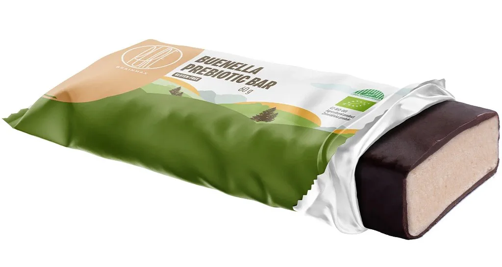 BrainMax Pure Prebiotic Bar Buenella je prebiotická tyčinka s lahodnou náplní z lískooříškového krému, obalená v mléčné čokoládě. Každé sousto skrývá bohatou chuť mléčné čokolády a jemného lískooříškového krému, završené rýžovými křupavými kousky pro dokonalý chuťový zážitek. Díky BIO kukuřičné vláknině přispívá k optimální funkci trávicího systému, poskytuje výživu pro probiotické bakterie v našich střevech a podílí se na celkovém zdraví střev. 1 tyčinka obsahuje 12 g vlákniny, což je téměř polovina doporučené denní dávky.