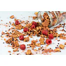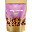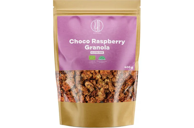 BrainMax Pure Choco Raspberry Granola a její velké křupavé kousky tvoří bezlepkové ovesné BIO vločky, se kterými se mísí chuť malin a hořké čokolády. To vše slazené kokosovým sirupem a kokosovým cukrem s přidáním kousků organických brusinek. Porci vlákniny a zdravých tuků zajistila chia semínka a celá granola je zjemněná BIO mandlovým krémem naší vlastní výroby. Granola je pečená spolu s ghí z BIO másla. Na 100g má granola téměř 12 g vlákniny a je vyráběna pouze z BIO surovin a neobsahuje lepek!
