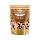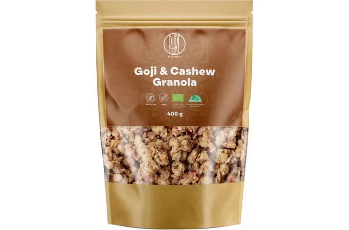 Poctivá ručně připravená granola, kterou jsme pro vás vyladili do naprosté dokonalosti. Spojili jsme kešu oříšky ve formě másla i celých oříšků společně s bezlepkovými ovesnými vločkami, lněnými a dýňovými semínky. Celou krémovou chuť kešu ořechů jsme podtrhli sladkokyselým tónem goji. Optimálním pečením a ruční přípravou jsme docílili toho, že krásně křupe a rozplývá se v ústech. Navíc je tato kvalitní směs zapečeného müsli vyrobena jenom a pouze z BIO ingrediencí.