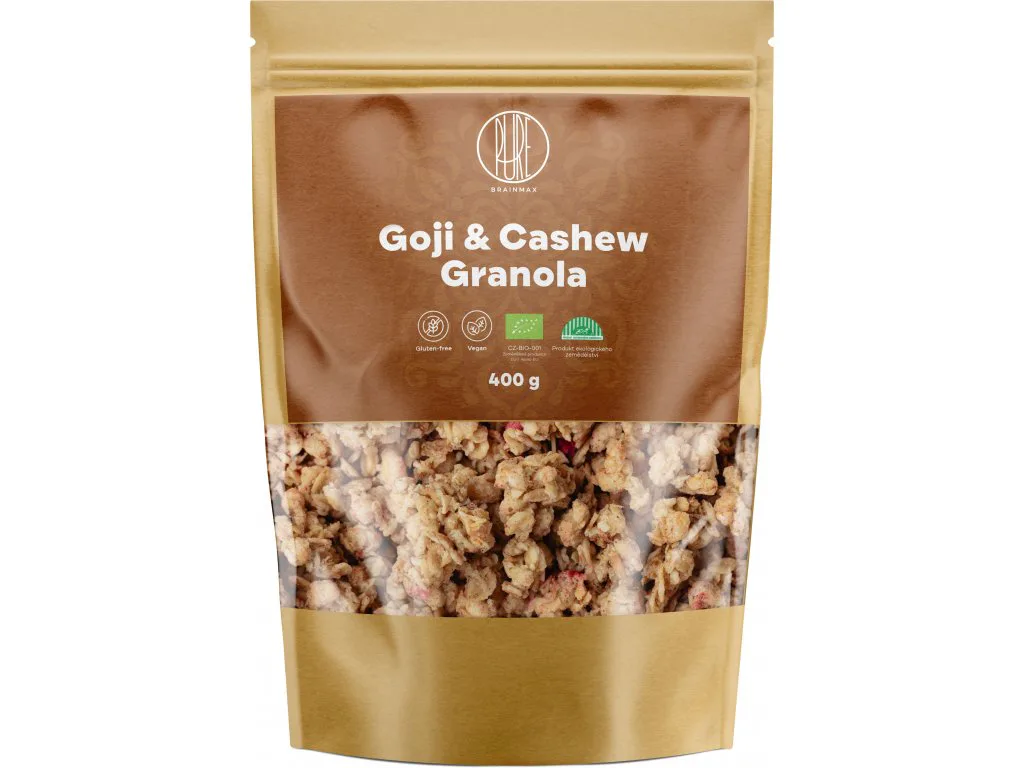 Poctivá ručně připravená granola, kterou jsme pro vás vyladili do naprosté dokonalosti. Spojili jsme kešu oříšky ve formě másla i celých oříšků společně s bezlepkovými ovesnými vločkami, lněnými a dýňovými semínky. Celou krémovou chuť kešu ořechů jsme podtrhli sladkokyselým tónem goji. Optimálním pečením a ruční přípravou jsme docílili toho, že krásně křupe a rozplývá se v ústech. Navíc je tato kvalitní směs zapečeného müsli vyrobena jenom a pouze z BIO ingrediencí.