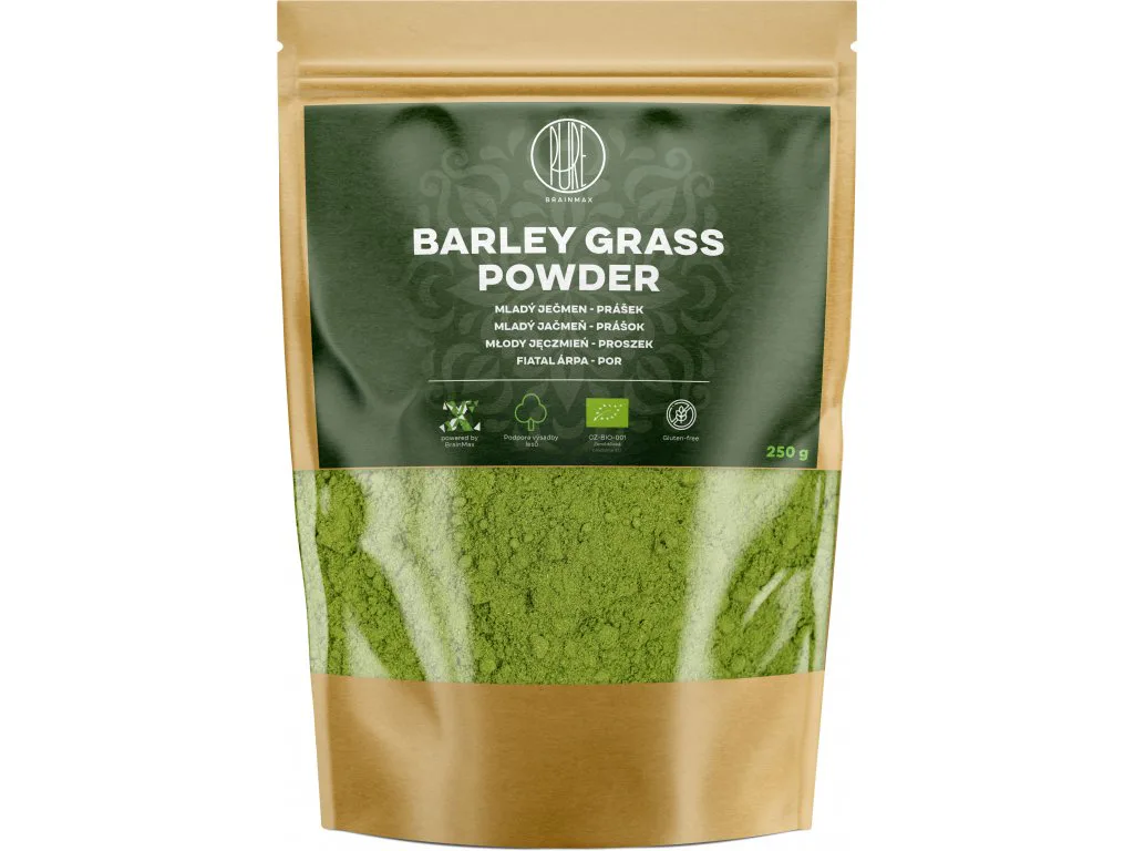 BrainMax Pure Mladý ječmen pochází listů mladých rostlin ječmene. Sklízí se v období před výkvětem, protože v této době obsahuje nejvíce cenných živin a neobsahuje lepek. Po sklizni prochází šťáva z listů sušením a díky tomu si zachovává veškeré cenné látky. Je pěstován v souladu s ekologickým zemědělstvím, neobsahuje žádné pesticidy, herbicidy ani jiné látky a nese tak označení BIO. Organický prášek z mladého ječmene lze použít jako přísadu do smoothies nebo jednoduše rozmíchat ve sklenici vlažné vody spolu s citrónovou nebo limetkovou šťávou.