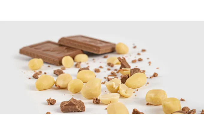Složení: Arašídy 75%*, mléčná čokoláda (maltitol, kakaové máslo, sušené plnotučné mléko, kakaová hmota, lecithin, přírodní vanilkové aroma). *Surovina v BIO kvalitě. Tento produkt obsahuje 75 % ingrediencí v BIO kvalitě.