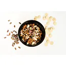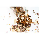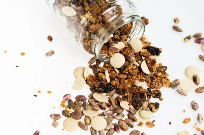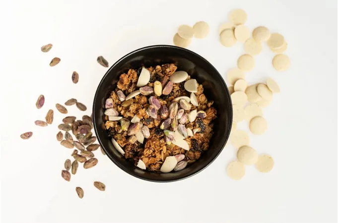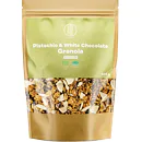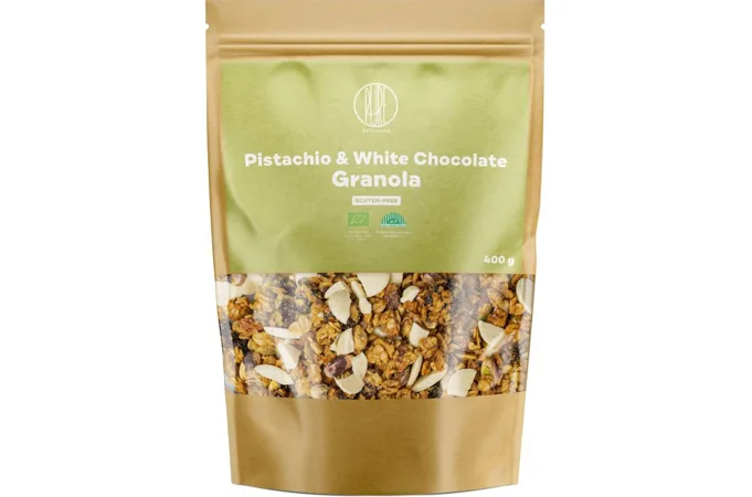 Křupavé kousky granoly z bezlepkových BIO ovesných vloček, ke kterým jsme přidali BIO pistácie. Ty jsou zdrojem kvalitních tuků s vysokým podílem nenasycených mastných kyselin a vitamínů skupiny B. Pro sladší a jemnější chuť jsme granolu doplnili o kousky bílé čokolády a námi vyrobený mandlový krém z BIO mandlí. Jako tuk zde posloužilo BIO ghí, které má příjemnou máslovou vůni s lehkým oříškovým aroma. Kromě toho obsahuje zdraví prospěšné omega 3 a 6 mastné kyseliny doplněné o látky udržující zásadité prostředí v těle. Obsahuje kyselinu máselnou, která je důležitá pro naši střevní sliznici.