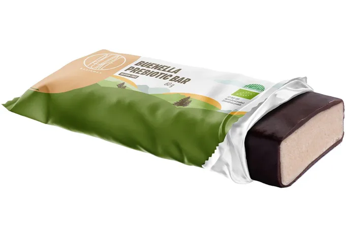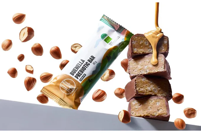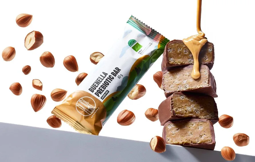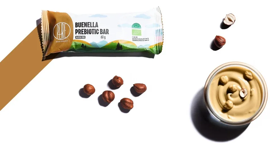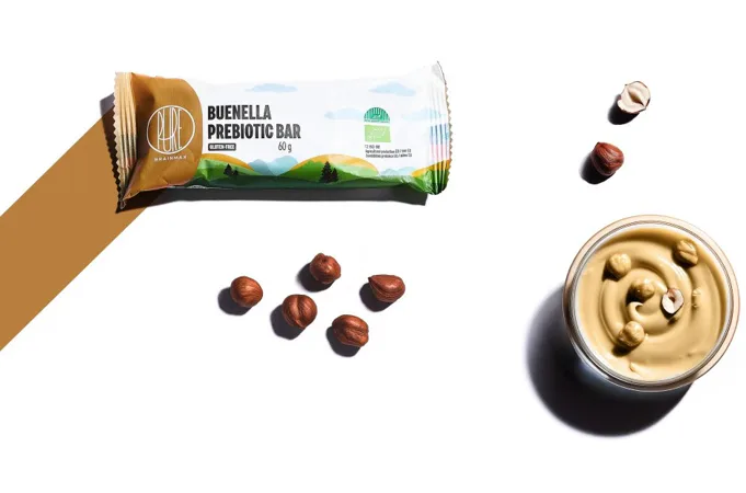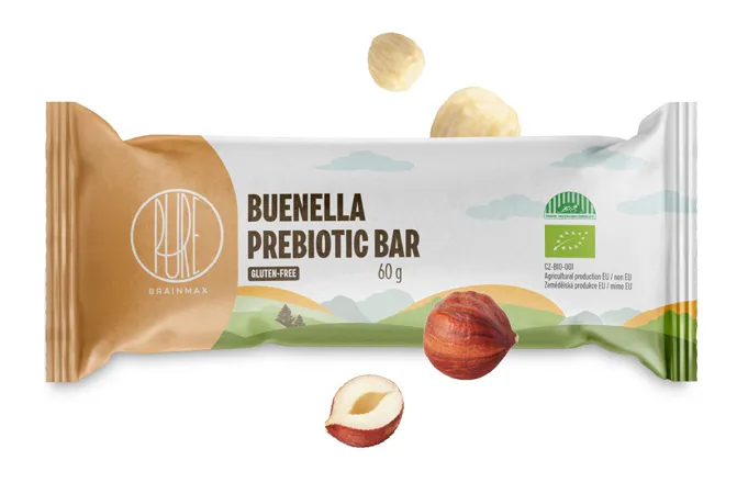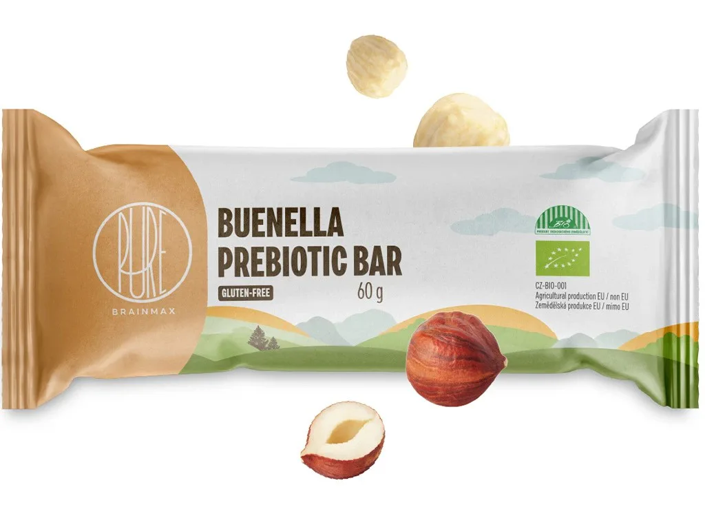 BrainMax Pure Prebiotic Bar Buenella je prebiotická tyčinka s lahodnou náplní z lískooříškového krému, obalená v mléčné čokoládě. Každé sousto skrývá bohatou chuť mléčné čokolády a jemného lískooříškového krému, završené rýžovými křupavými kousky pro dokonalý chuťový zážitek. Díky BIO kukuřičné vláknině přispívá k optimální funkci trávicího systému, poskytuje výživu pro probiotické bakterie v našich střevech a podílí se na celkovém zdraví střev. 1 tyčinka obsahuje 12 g vlákniny, což je téměř polovina doporučené denní dávky.