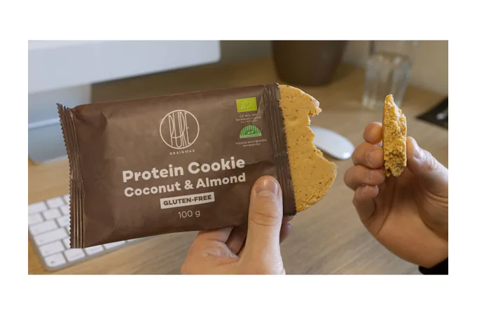 Sladká chuť je zásluha BIO kokosového sirupu a inulinu. Nutričně vyvážená sušenka, ve které je téměř 22 g bílkovin a bezmála 18 g vlákniny. Při výrobě jsme použili vybrané BIO ingredience a jako ostatní sušenky je i tato bez lepku. Cookieska BrainMax Pure Protein Cookie je krásně vláčná skoro až krémová, takže se nemusíte bát, že by vám drhla v krku.