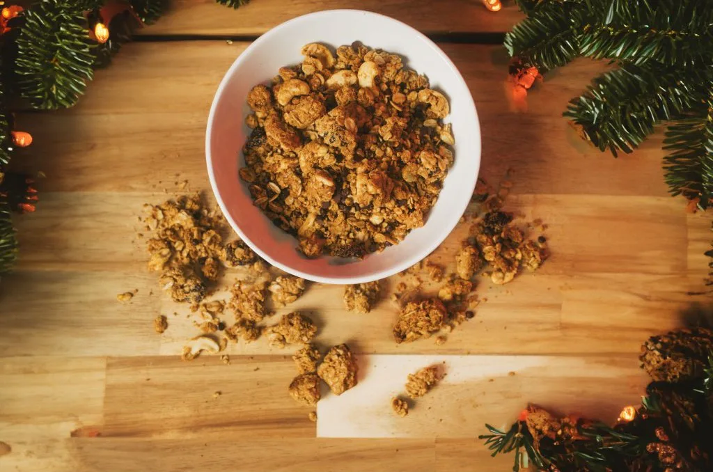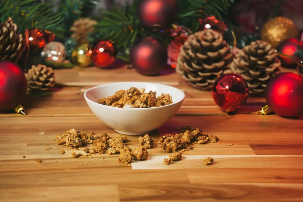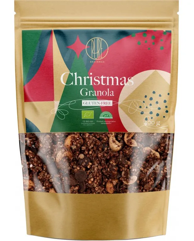 Vánoce se blíží a tak jsme zařadili do nabídky vánoční granolu s vůní perníkového koření. Jako základ jsou použity bezlepkové BIO vločky, které doplňují kousky hořké čokolády. Vánoční granola jsou velké křupavé kousky s jemnou sladkou chutí, kterou podtrhuje kešu krém z organických mandlí, brusinky a sladké aroma perníkového koření. Jako tuk je použitý kokosový olej a granola je slazená kokosovým sirupem. Je vhodná pro vegany a 95% ingrediencí je v BIO kvalitě.