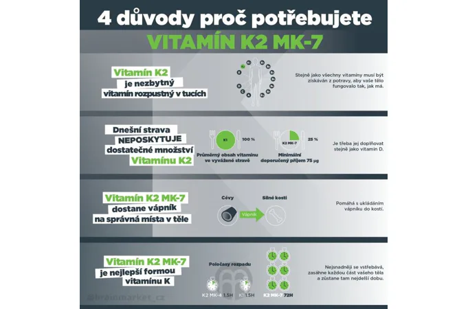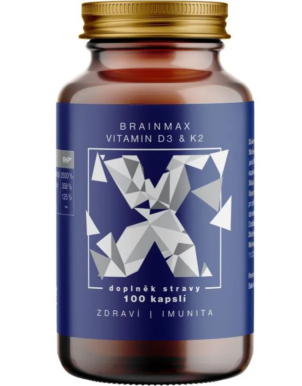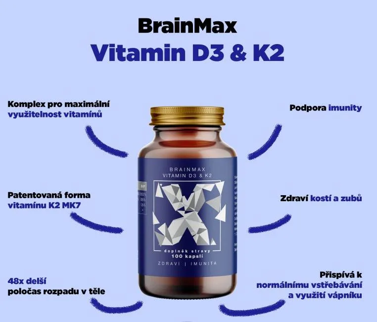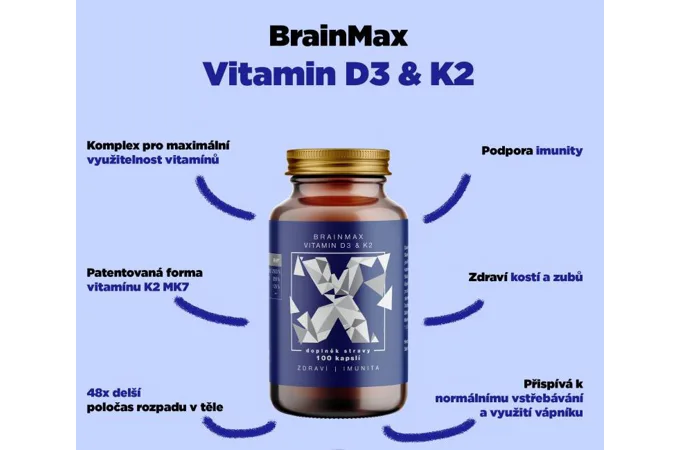 BrainMax Vitamin D3 & K2 kombinuje vitamíny D3 a K2 jako MK7, dvě mikro živiny, které byly rozsáhle zkoumány pro svou roli ve zdraví kostí, zubů a kardiovaskulárního systému. Vitamin D3 podporuje ukládání vápníku do kostí, čímž zlepšuje zdraví kostí. S vyšším příjmem vitamínu D3 může souviset ukládání vápníku do cév (kalcifikace cév). Z tohoto důvodu jsme k vitamínu D3 přidali vitamín K2 jako MK7, který čistí cévy od vápníku a pomáhá ukládat vápník do kostí. Je to binární zbraň, naprostá synergie dvou esenciálních vitamínů, které jsou důležité pro celkové zdraví. Vitamín D3 si naše tělo v létě vytvoří ze slunečního záření, ale vitamín K2 můžeme přijímat pouze z potravy. Dosáhnout však na jeho na požadovanou denní potřebu je prakticky nemožné.