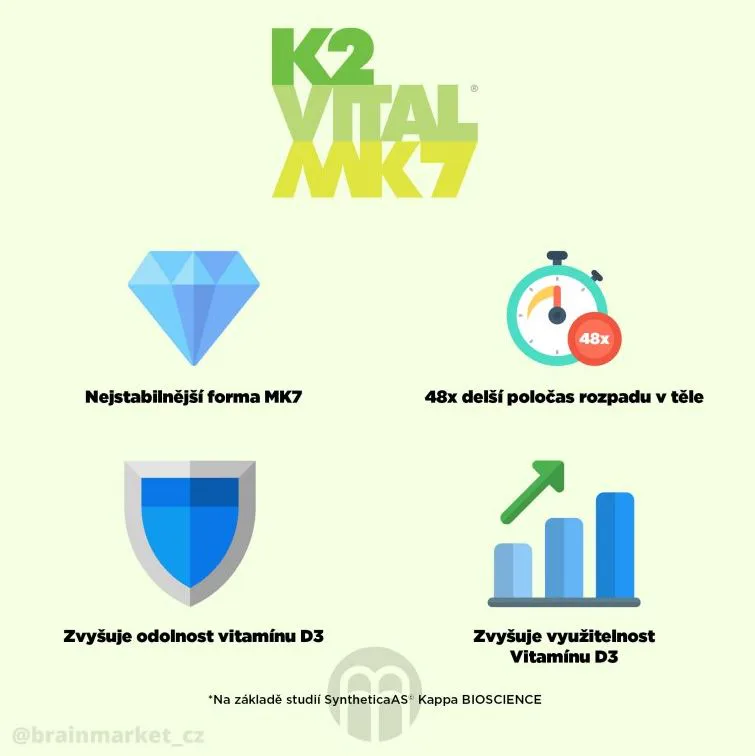 Tato patentovaná forma Vitamínu K2 ve formě MK7 all-trans je mnohem stabilnější než jiné formy Vitamínu K2. Tuto stabilitu přenáší i na Vitamín D3, se kterým je v kapsli. Vyznačuje se vysokou využitelností pro tělo a zvyšuje biodostupnost i samotného vitamínu D3. Oproti běžným formám Vitaminu K2, které mají v těle poločas rozpadu 1,5 hodiny, zůstává tato forma Vitamínu K2 v těle 78 hodin. To znamená 48x delší poločas rozpadu v organismu.