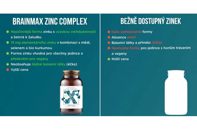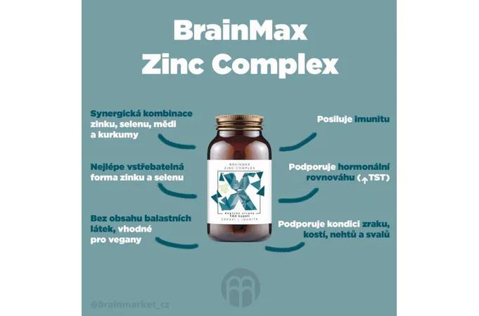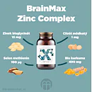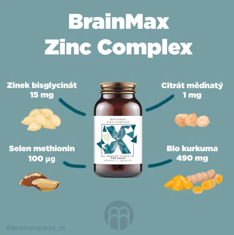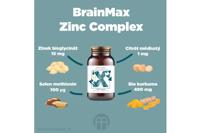 BrainMax Zinc Complex je synergická kombinace vysoce biodostupné formy zinku, selenu, mědi. Každá kapsle obsahuje 15 mg elementárního zinku, 1 mg mědi a 490 mg bio kurkumy. Zinek ve formě bisglycinátu zinečnatého je pro tělo nejlépe vstřebatelnou formou a v kombinaci s mědí ve formě citrátu se ještě zvyšuje jeho vstřebatelnost.